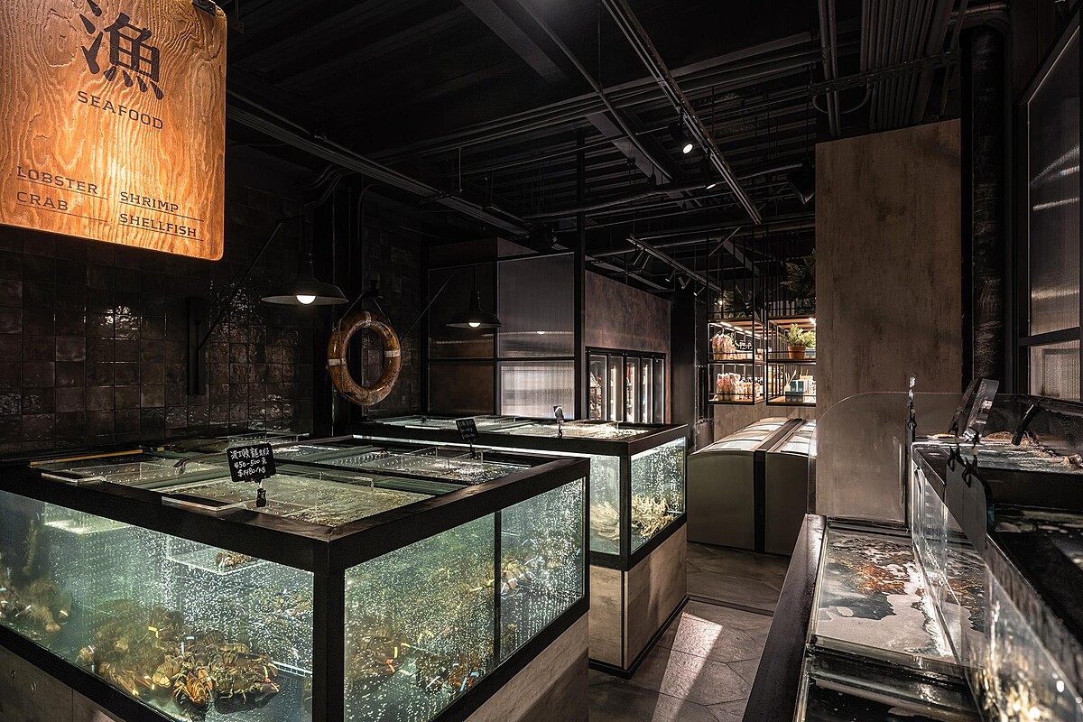 四行倉庫佔地約70坪,緊鄰著燒肉中山台中店,以店中店的方式呈現,除了販售頂級肉品外,個斥資百萬建造不同溫層的水族箱,引進高品質的活體海鮮,如:帝王蟹、松葉蟹、種類豐富的龍蝦等。