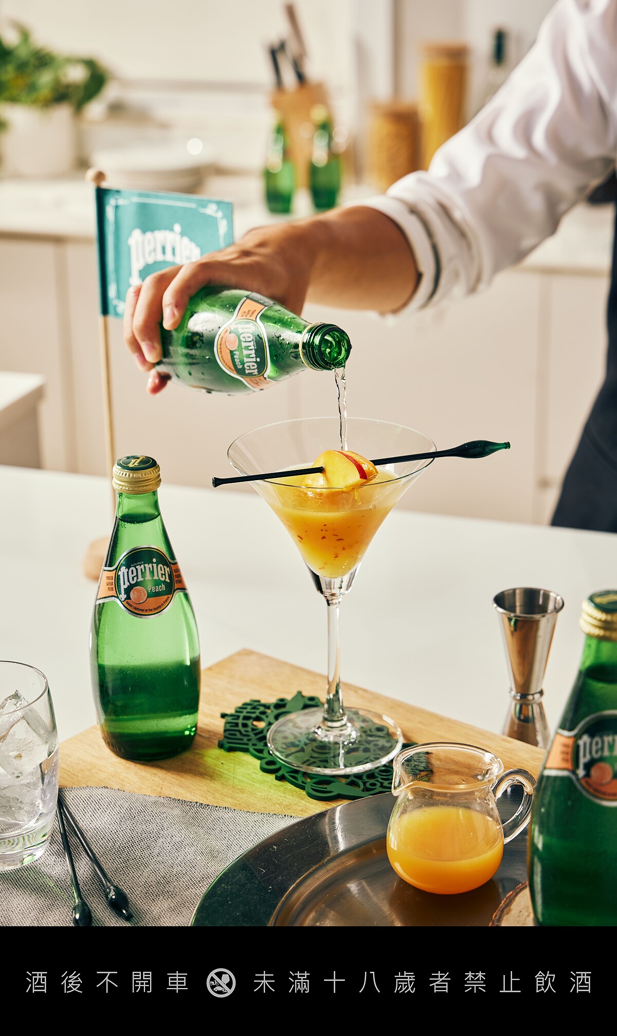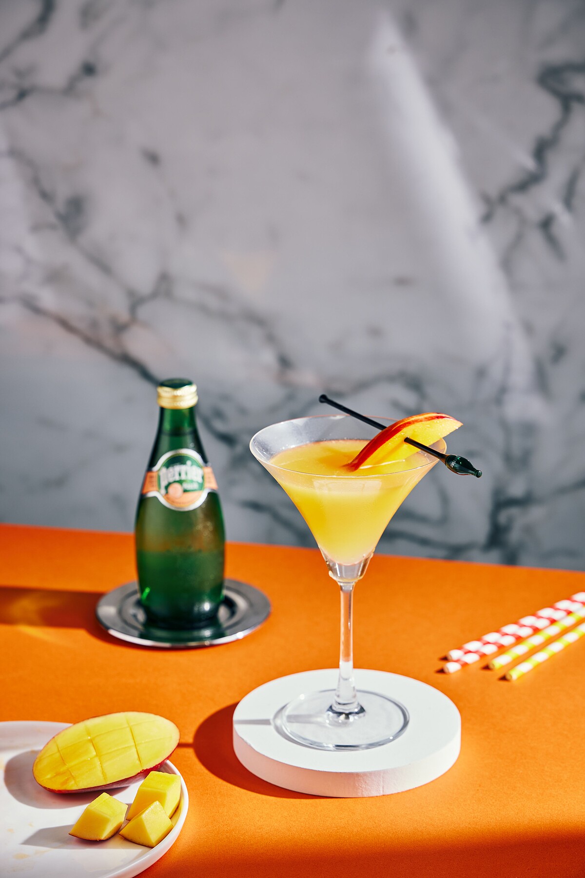 使用沛綠雅水蜜桃風味氣泡水搭配芒果製成,加入琴酒、水蜜桃汁。