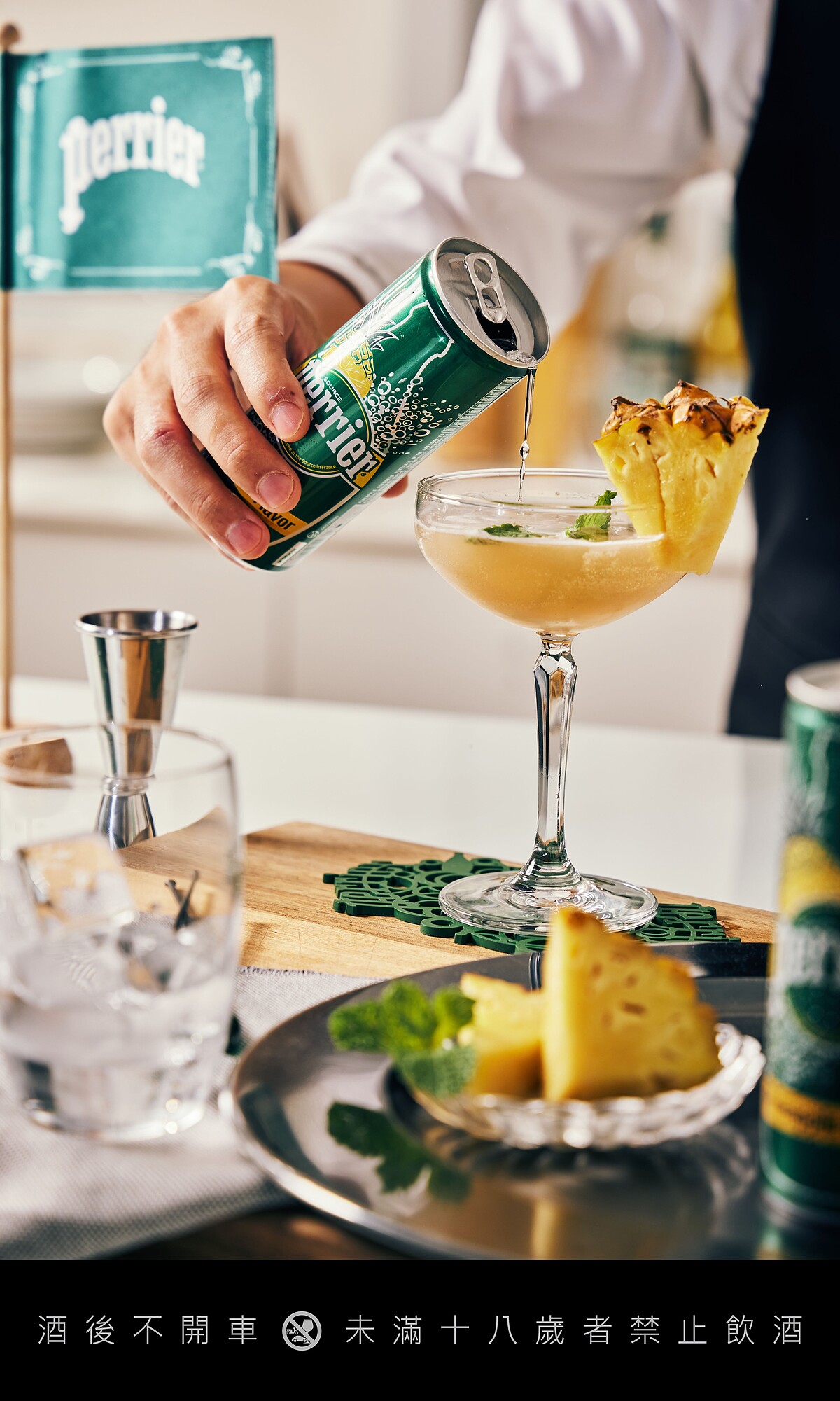 使用沛綠雅鳳梨風味氣泡水搭配鳳梨、葡萄柚汁製成,加上白色萊姆酒。