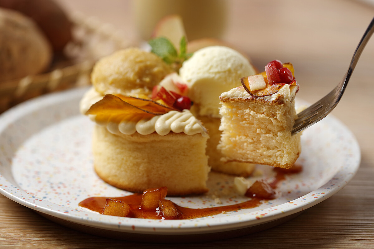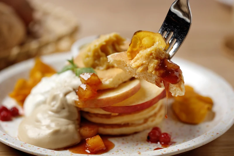 以老饕最愛的厚鬆餅搭配甘藷奶油與冰涼的香草冰淇淋,再擠上清爽的甘藷鮮奶油、以及肉桂蜜醃漬的蘋果丁、蘋果片、脆口甘藷片、莓果等裝飾點綴,甜而不膩,讓人忍不住一口接一口。