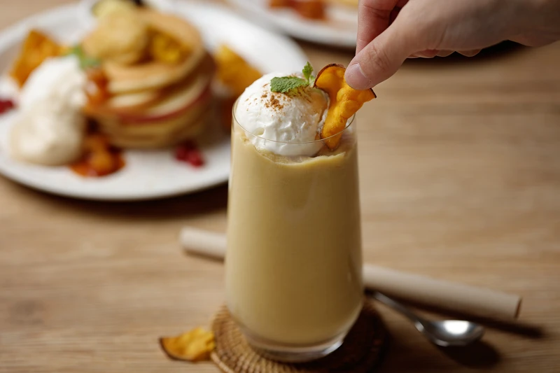 料理長將甘藷奶油、牛奶及黑糖蜜打製成如奶昔般清爽圓潤風味,再撒上些許肉桂粉、乾燥甘藷片點綴,雖然是冷飲,但入口仍能感受到甘藷的厚實香氣,不涼不躁,搭配甜薯鬆餅一起享用剛剛好。