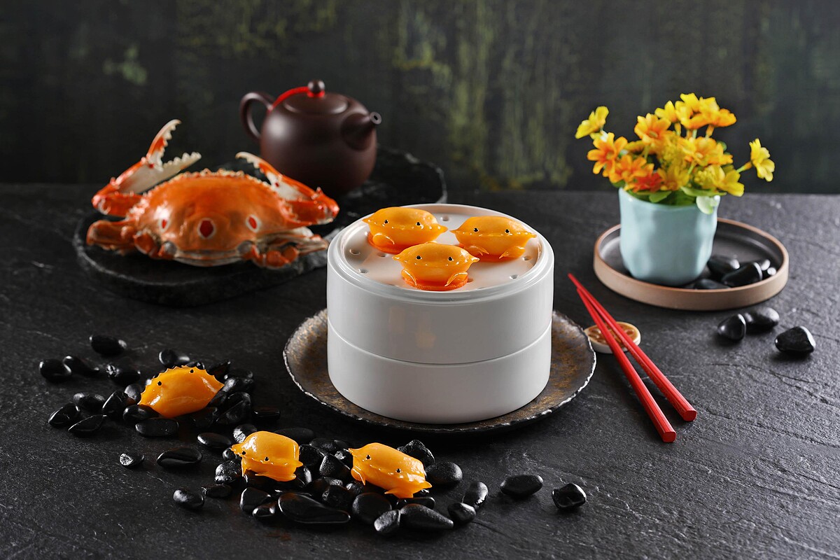 以熱水沖熟的澄麵再加入進口的紅蘿蔔粉,製成天然橘紅色麵皮,包入以現拆石蟳蟹肉、蝦肉、明太子拌成的內餡,製作出一隻隻造型吸睛的小螃蟹,再放入籠蒸熟,一次滿足饕客們的視覺與味蕾。
