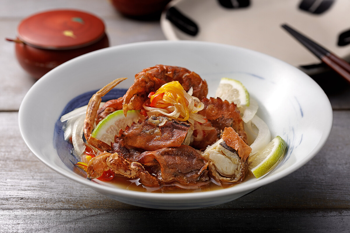 將炸過的軟殼蟹浸泡於南蠻醋汁裡,讓整體風味酸甜又開胃,十分清爽。