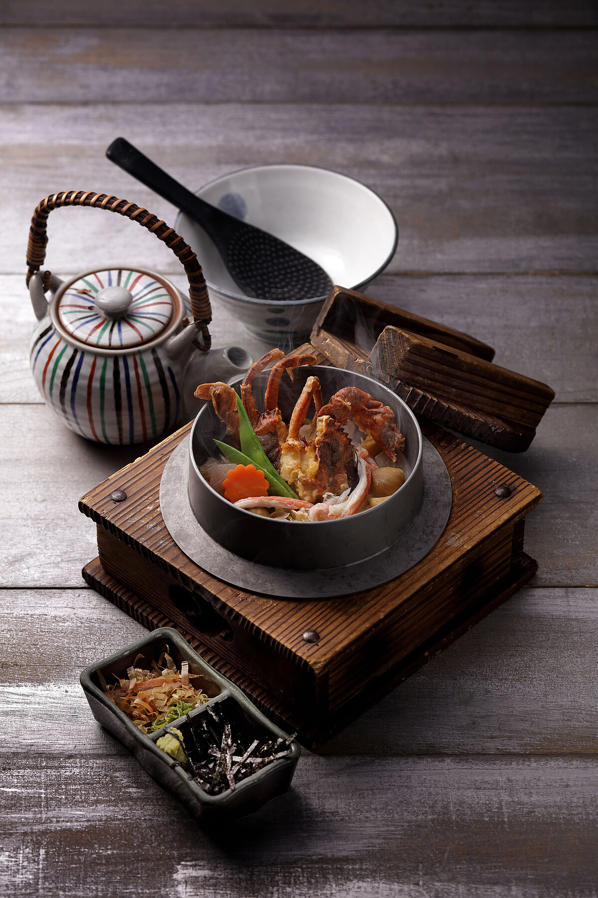 將軟殼蟹與栗子兩大秋季食材完美結合!釜飯裡能夠品嘗到松葉蟹肉、栗子、牛蒡、豆皮、蒟蒻,最上層在鋪上炸至金黃酥脆的軟殼蟹,除了可以翻拌享用外,推薦大家可以試試淋上柴魚昆布高湯一起享用,別有一番風情。