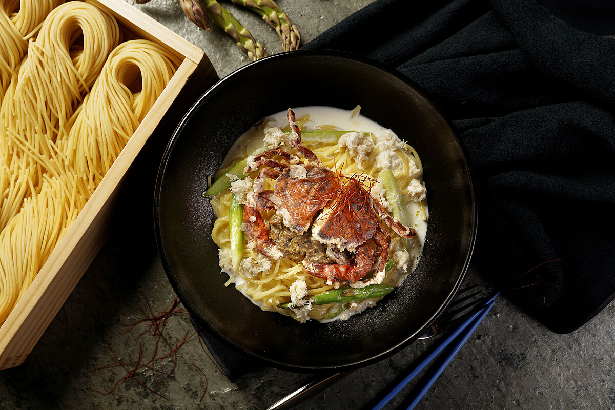 此外,還有將整隻軟殼蟹剖半酥炸,能夠吃到香濃的松葉蟹蟹膏、飽滿藍鑽蟹肉共三種蟹風格的「軟殼蟹奶油義大利麵」,每一口都是濃濃的鮮甜滋味。