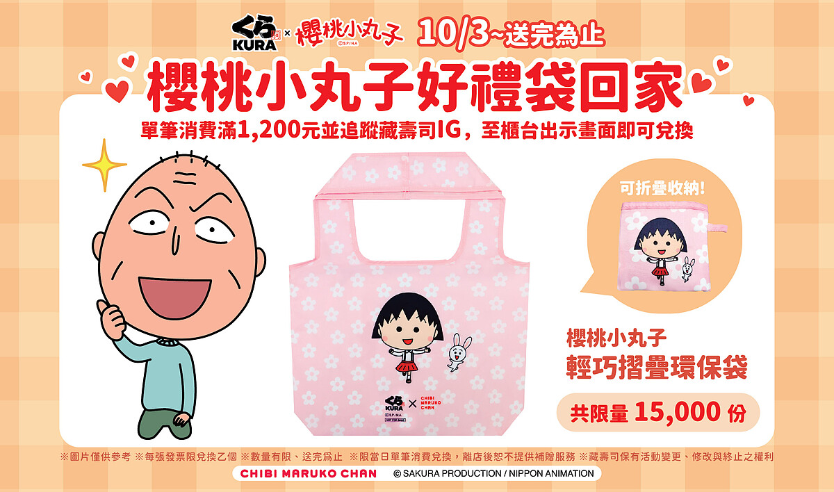 藏壽司繼之前推出櫻桃小丸子聯名店面及商品後,這次再度推出全新的滿額贈活動啦!只要消費滿額,並完成活動指令,就可以把「櫻桃小丸子輕巧摺疊收納袋」免費帶回家,小丸子迷們快準備衝一波!