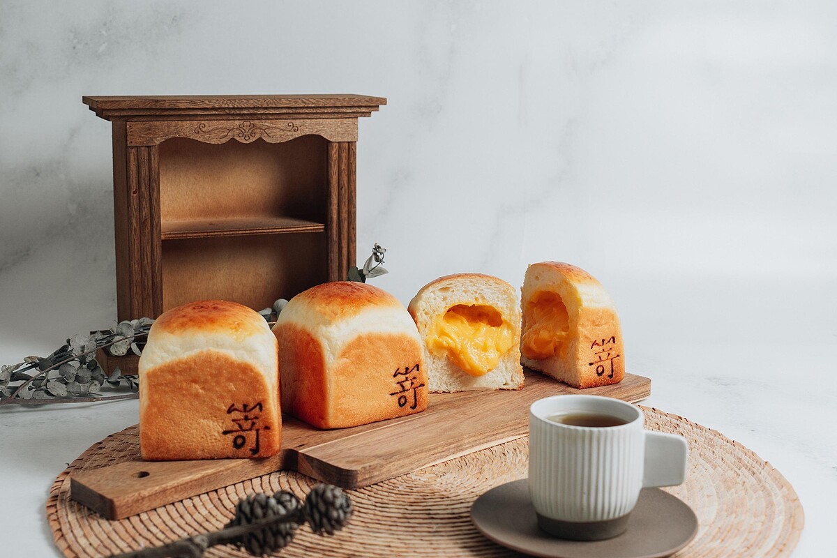 不僅如此,還有外觀是迷你版的奶黃生吐司推出限定禮盒,包裹嚴選國際認證屏東「鹽紅土鴨蛋」醃製而成的馥郁奶黃餡,搭配外層Q彈生吐司,奶香與蛋香的完美結合,只有在大直美麗華與台中新光獨家販售。