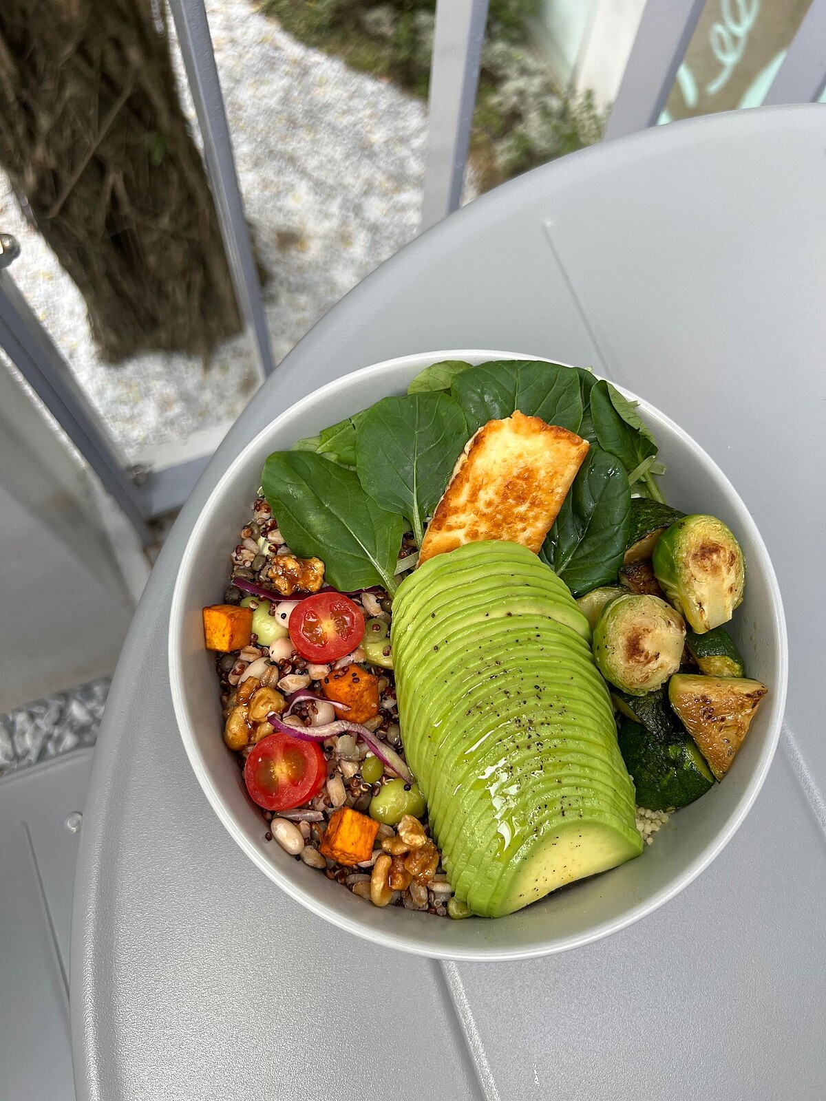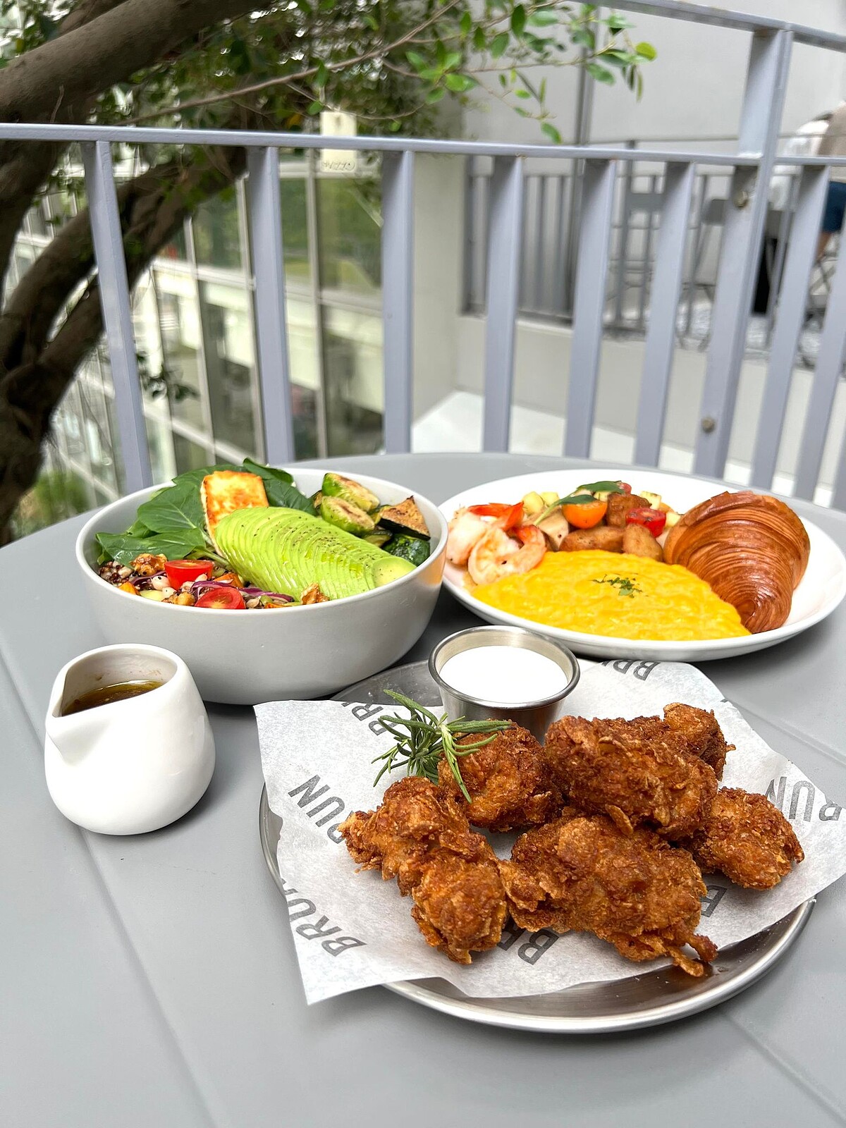 除了美美的用餐空間,BRUN不然的餐食更是一點也不馬虎,全新推出的蔬食餐點「酪梨蔬菜碗」,選用進口酪梨,搭配超過10種的蔬菜與超級食物,包含藜麥,北非小米、法羅麥、白豆、肯瓊香料烤地瓜,堅果、番茄孢子甘藍、櫛瓜、煎哈魯米乳酪等,吃起來清爽又無負擔。