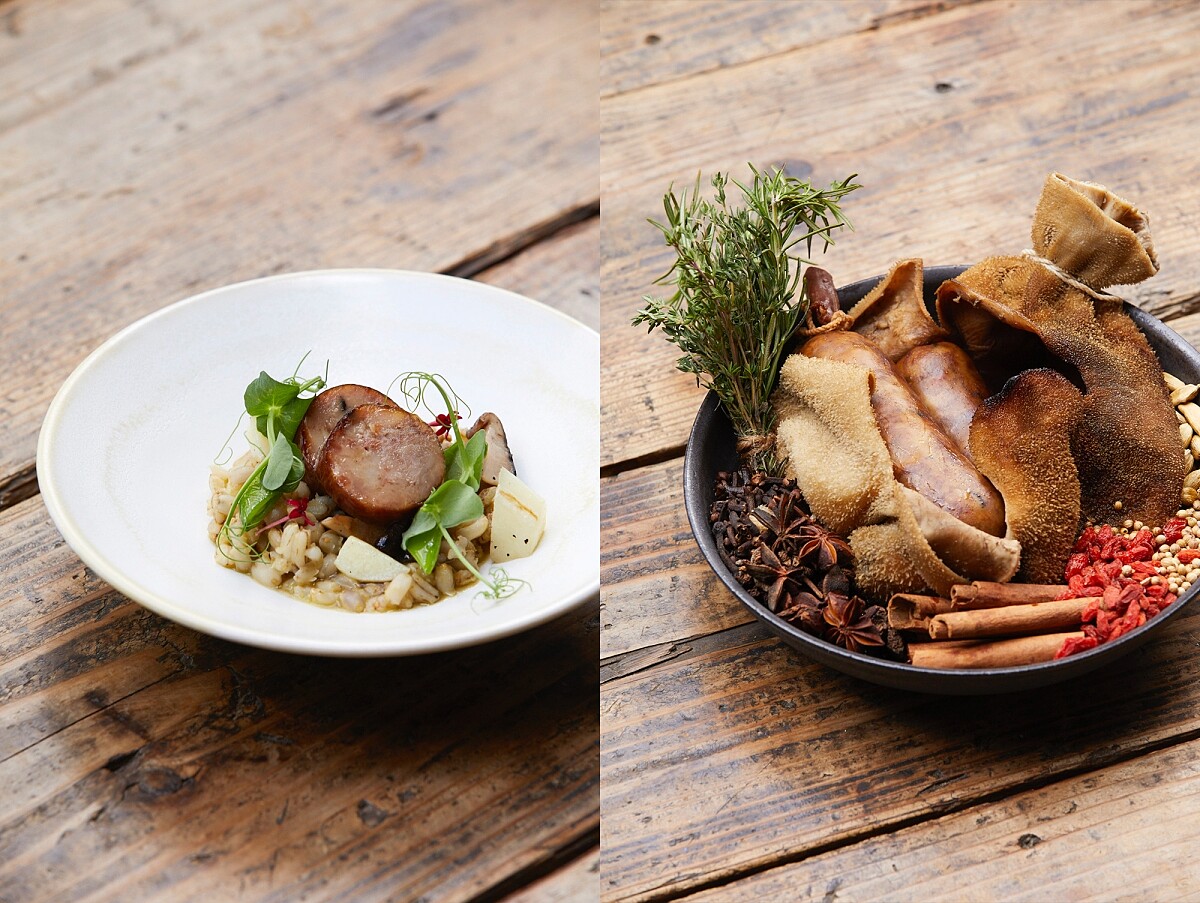 藏飯是藏族的家常料理,烹飪過程變化不大,就像是家家戶戶都有的家常菜,能喚起對家的記憶。 使用羊肩肉與白蝦一起攪打成有彈性的肉腸餡、灌入羊腸腸衣中,再與中式滷汁及燒紅的鵝卵石共同投入羊肚中做悶燒燉煮,羊肚就好似壓力鍋般,能將風味濃縮至食材中,接著進行快速煎烤,最後搭配炭烤青椒與羊奶起司風味的青稞燉飯、淋上炭燒香菇醬汁。