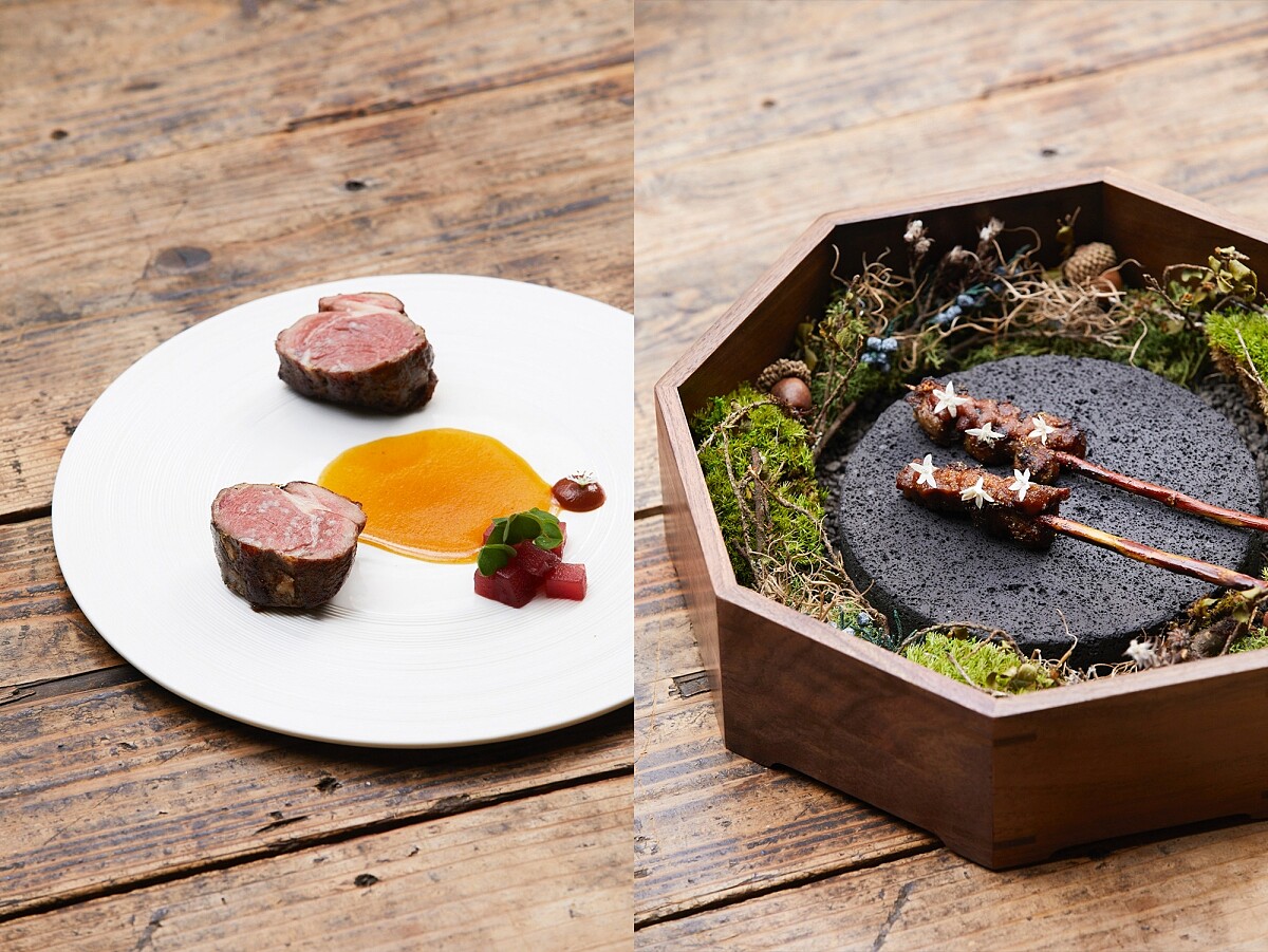 主菜講述這是主廚與西藏家人在山林、野外篝火烤肉的美好記憶,因此料理手法採火烤,將LUMINA 羊排以兩種不同的烹調手法展現豐富的料理特色,其一為里肌煎烤至七分熟後,配上木質調的牛蒡醬汁,串在紅柳枝條上,濃厚的木質香氣撲鼻而來;另一則將油脂豐富的五花煎至酥香,襯著酸甜的蘋果辣醬、自製香料粉與洛神花紅酒燉蘋果佐料,提升口感上的亮度與多元層次。
