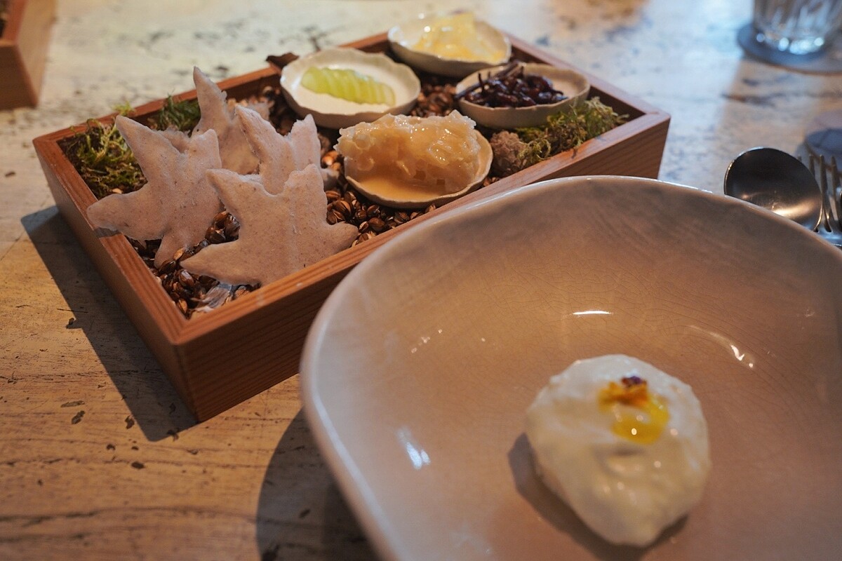 甜點靈感來自主廚曾吃過的傳統甜點,以白乳酪搭配天然蜂巢,簡單的搭配卻為之驚艷。作法則使用溫熱的牛奶沖泡洋甘菊以取其風味,接著製成慕斯,再搭上檸檬調味的白乳酪,其他還有芋頭椰奶脆片、糖漬檸檬、青葡萄、柚子油、蜂巢、嚐起來似紅豆風味的蕨麻,並隨之附上使用動物鮮奶油、茶液調和模擬酥油茶風味的飲品。