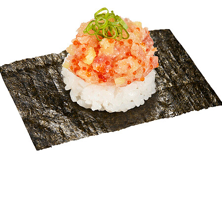 以鮪魚的油脂風味搭配醃黃蘿蔔的爽脆,再加上鯡魚卵、飛魚卵脆彈的口感,喜愛嚐鮮的人快來試試!