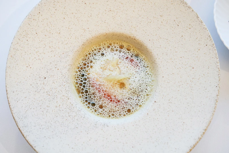 主廚將餐廳使用的各式蔬菜蒐集起來,接著烘烤焦糖化後,再熬製成湯,湯品雖無加入肉類卻帶有淡淡肉香,更擷取了南杏融入於湯品中,最後搭配煎烤過的松茸,點綴上花椒葉,是一碗代表秋天風味的湯品。