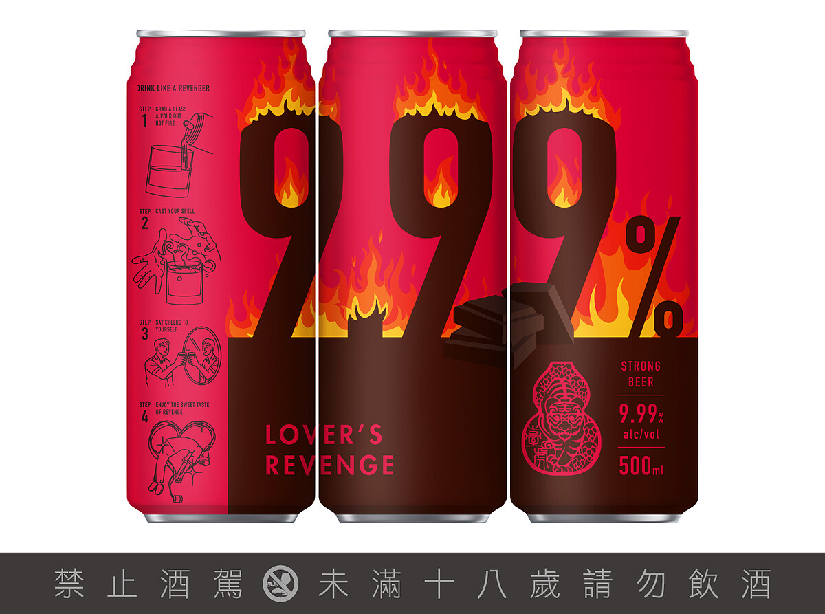 這款「9.99 愛人的復仇」外型也相當搶眼,以熊熊烈火作為主要視覺,搭配可可般的深咖啡色系,暗示罐中甜蜜而帶勁的辣椒巧克力風味,也針對位於9.99系列酒標側面、頗具識別度的「DRINK LIKE A PRO」的品酒4步驟插畫進行重新設計,帶領大家從開罐、醞釀心情到乾杯,第一次變壞就上手。