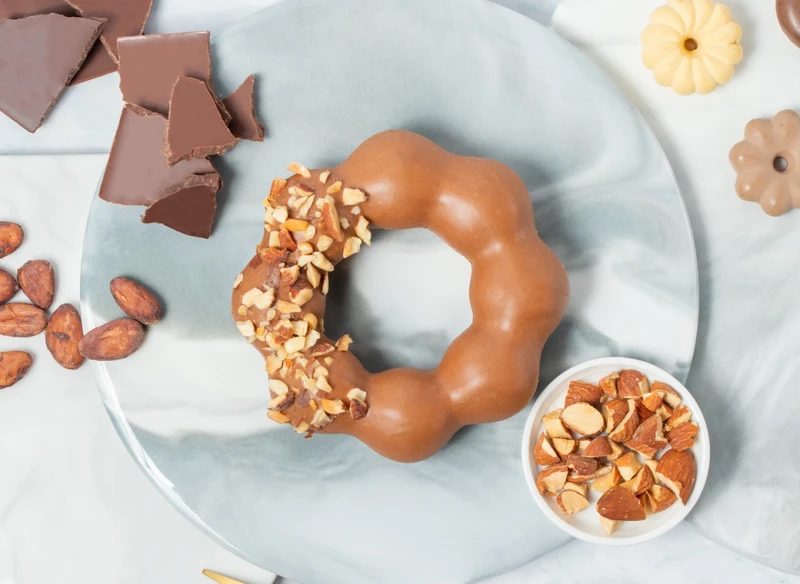 Mister Donut微流心巧克力甜甜圈餡料風味升級!為提升巧克力風味層次,特選富有榛果香氣的「焦糖榛果卡士達醬 」搭配「可可卡士達醬」作為雙重內餡「甜」滿每個角落,每咬一口內餡絲滑流出,滋味滑順有層次,最後表面舖上一層可可碎粒豆,增添口感。