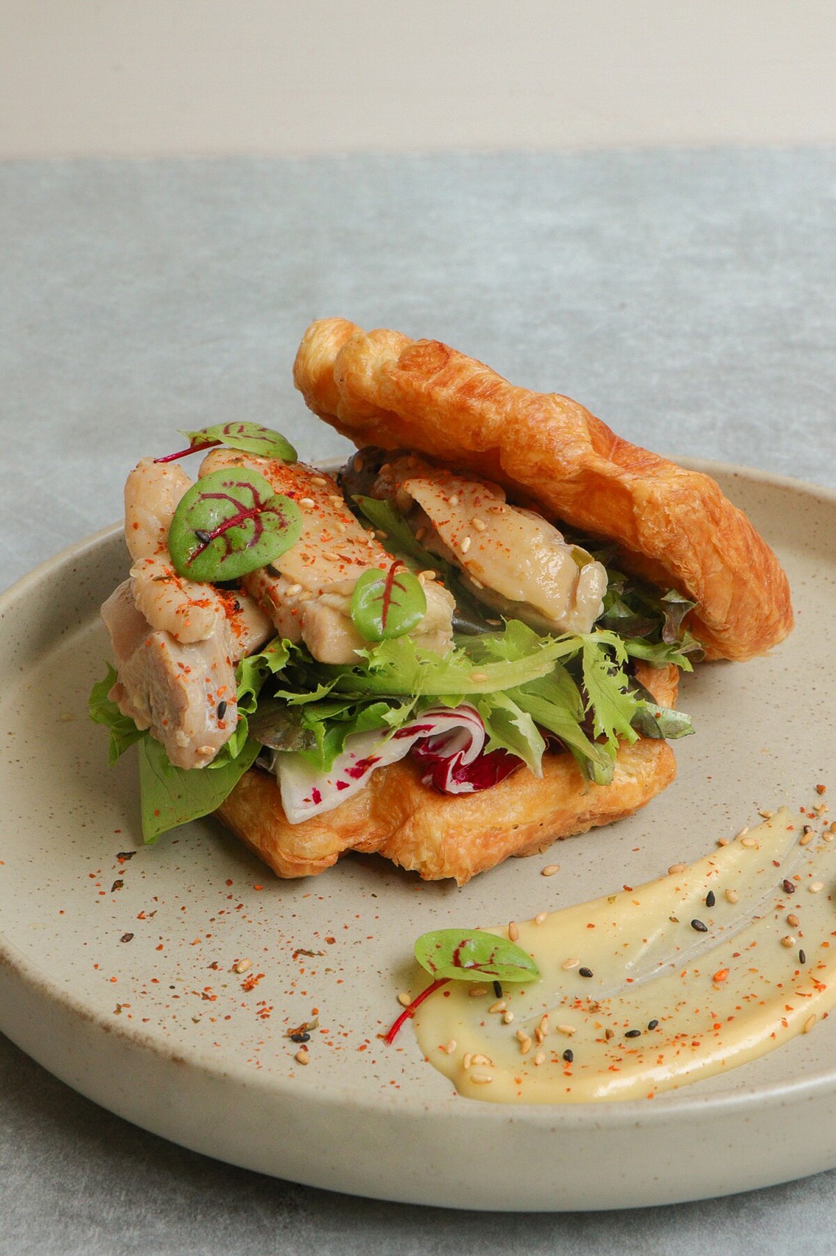 喜愛鹹食的人可以試試這款!將日式味噌雞與韓系可頌鬆餅碰撞出新火花,製作出外脆內軟的可頌鬆餅,溫潤厚實的口感,讓人忍不住一口接一口。