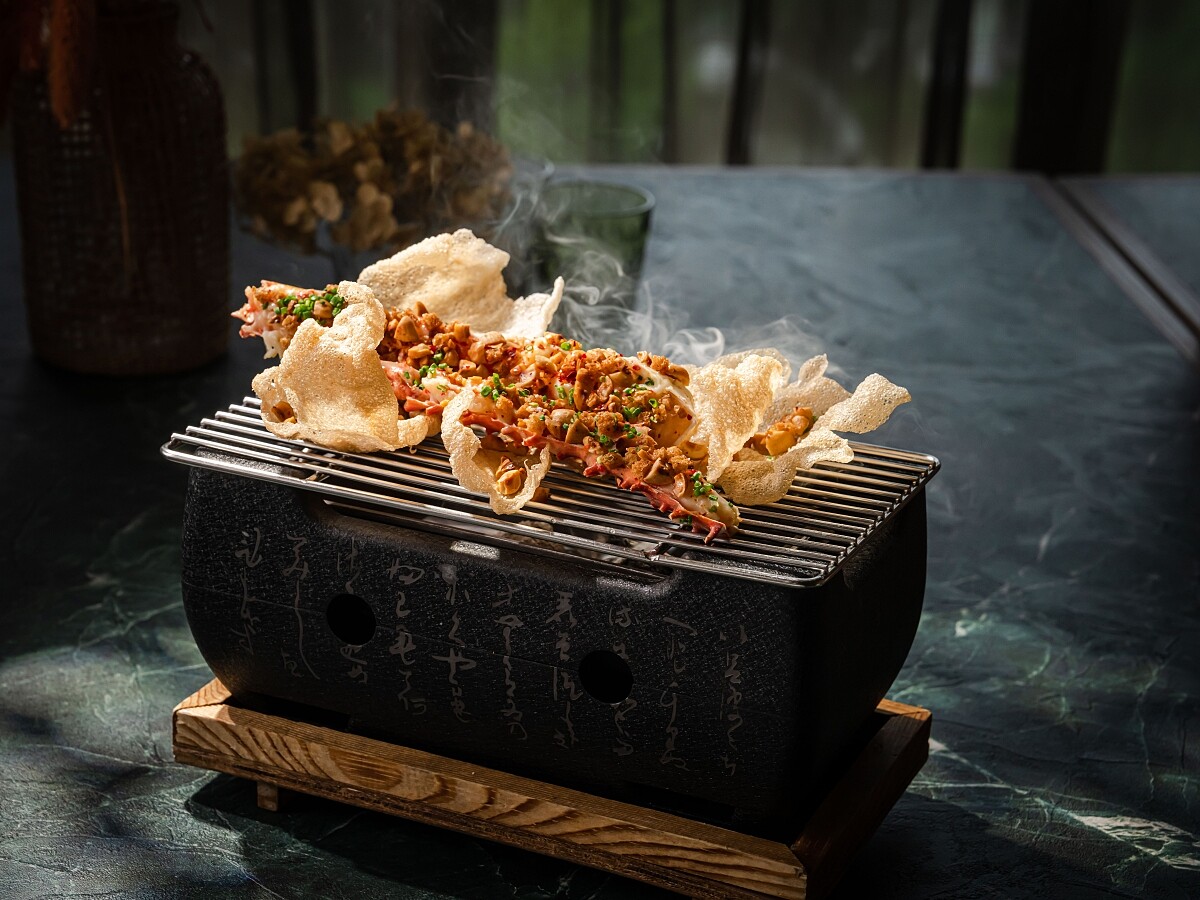 氣溫漸涼,因此特意選用辛香料增添暖,像是「鹽酥炸辣餛飩」「榛果蒜酥焗帝王蟹」以及「雙人板腱牛排—美國蛇河極黑牛」皆是全新菜色。