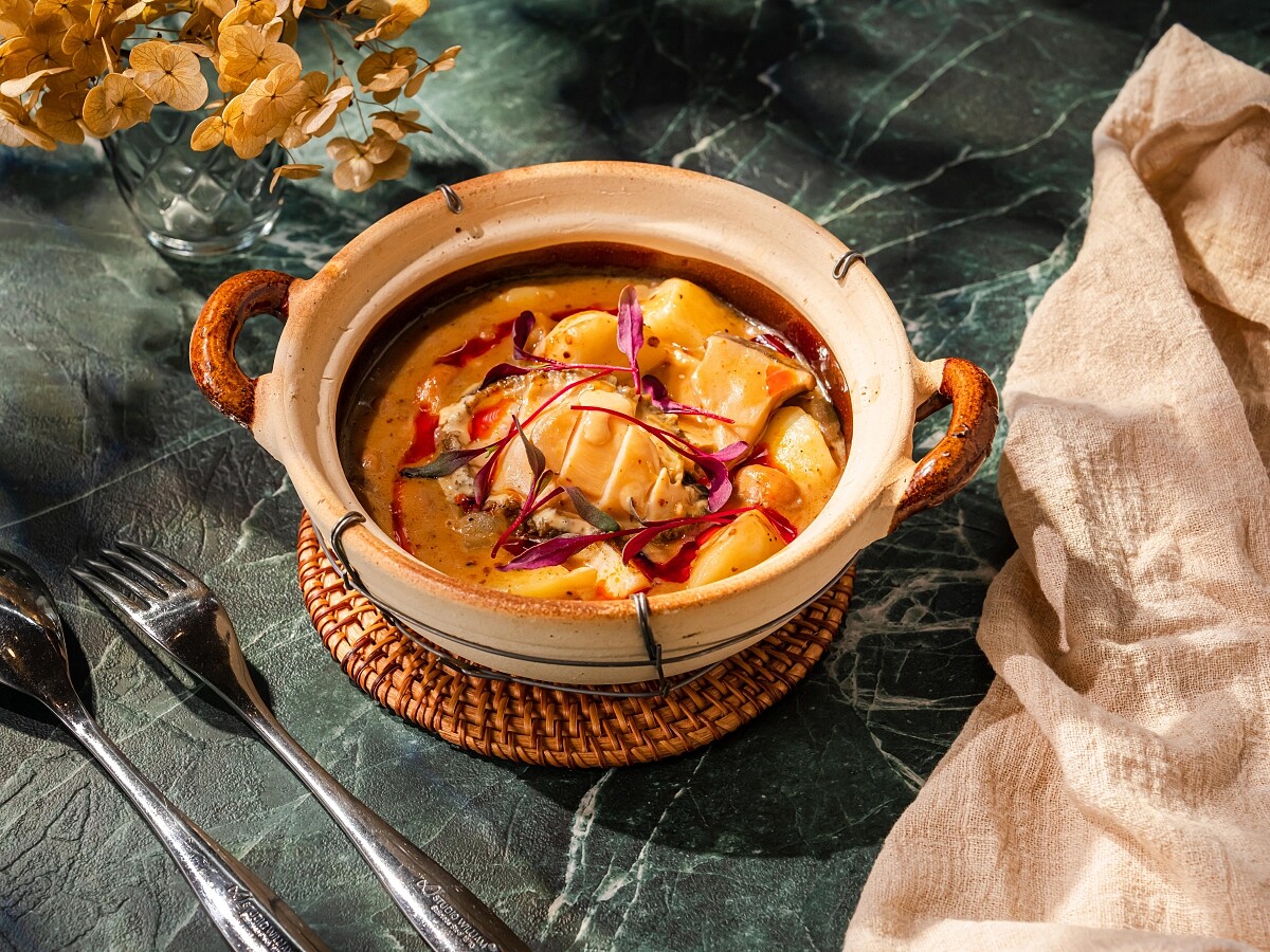 將魚、蝦、鮑魚等海味一起以台灣人熟悉的豆腐乳醬料為基底烹煮,並加入奶油增添圓潤,是一鍋濃郁溫暖適合秋冬的滋味。