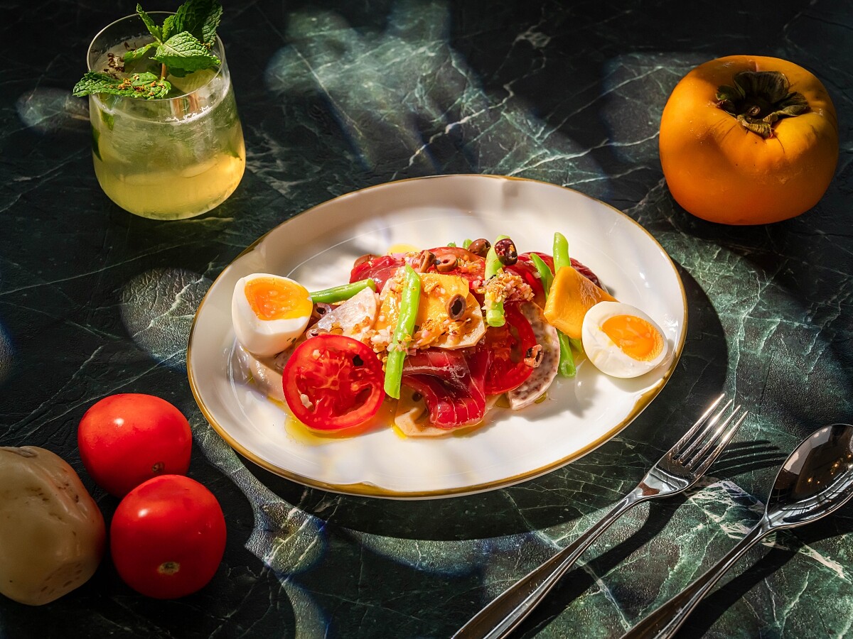 把國際經典菜以台灣味覺和食材重新打造,新增了季節限定的秋冬版本。秋冬版選用新鮮柿子切片,佐以當令白煮蓮藕、與先蒸後燻的鬆軟芋頭,再淋上季節特製「桂花油醋醬」,酸香平衡、飽滿暖心。