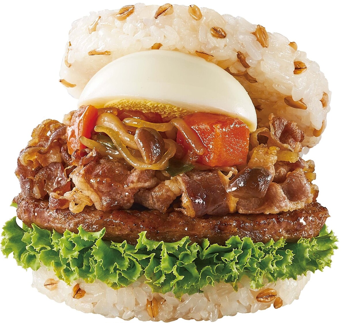 除了蛋黃哥堡外,喜愛日式風味的人可以試試「日出壽喜燒雙牛珍珠堡」,加入洋蔥、鴻喜菇、青蔥、紅蘿蔔、蒟蒻⋯等食材扮炒,再加醬油與入柴魚昆布高湯製成為日式壽喜燒醬調味的基底,並以摩斯人氣燒肉片、牛肉排,搭配青生菜與水煮蛋,層層堆疊在熱騰騰的超級大麥米飯上,喜愛米漢堡的人一定要試試!