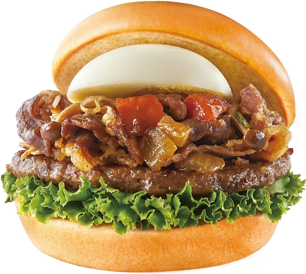 以優質牛肉製成內餡,以鐵板高溫拌炒帶出香氣後,與壽喜燒時蔬、水煮蛋與青生菜一起夾入漢堡麵包,入口感受甘甜肉汁香氣,口齒留香。