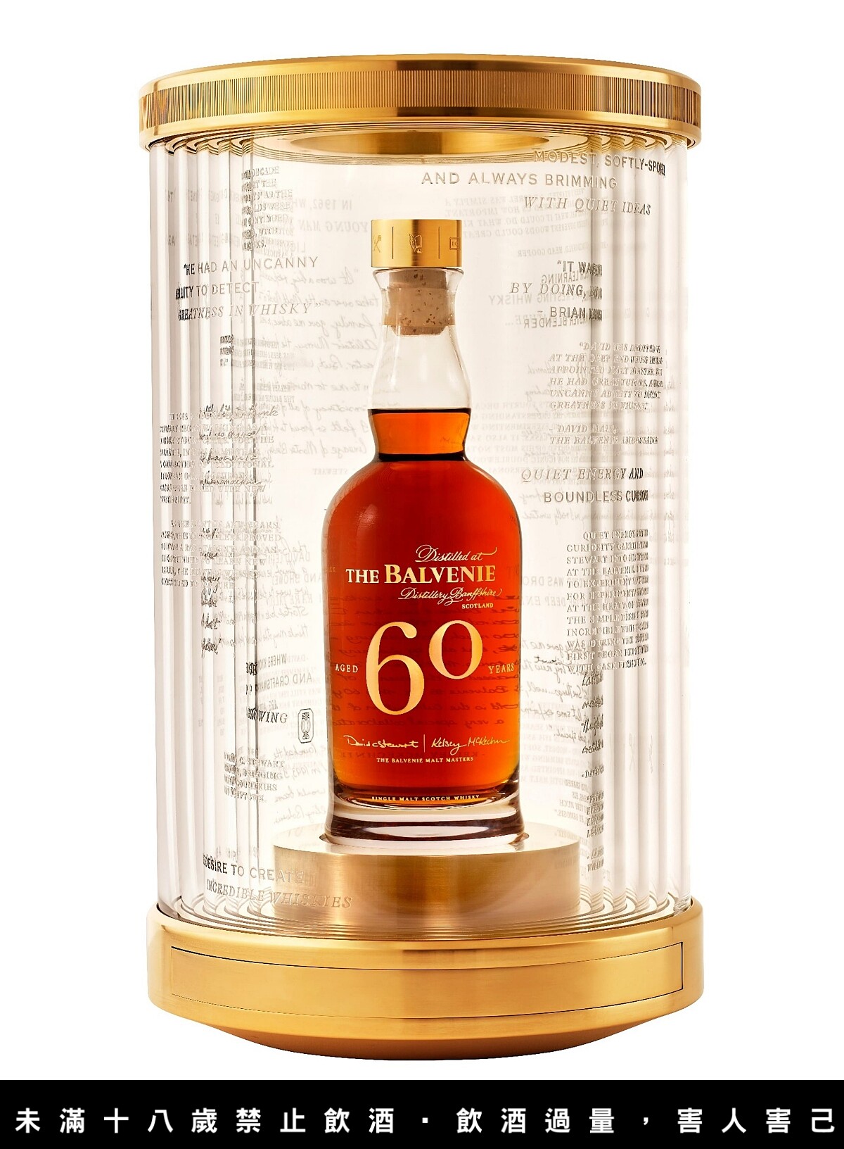 「百富60年 首席調酒師六十周年典藏版」除了極具紀念意義的珍稀威士忌酒液,包裝也將其重大意義設計融入,使用五層晶透玻璃,由外向內層層刻印著,來自大衛史都華60年生涯中重要人物的致敬;最內層的手工訂製水晶瓶身,雅致極具百富一貫的細膩高級,瓶身上記錄著凱西麥肯尼的致敬,象徵他工藝的傳承,以及即將開啟的下一個新篇章。