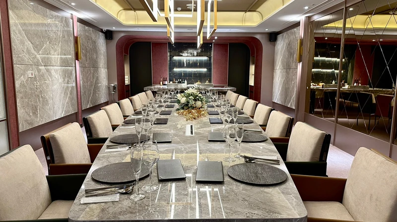 而座位區規劃出20席橢圓大理石桌面用餐區,另有2間各10席的半開放包廂,另有1間VIP預約包廂16席次,人數夠多也可以直接包下整個包廂!此外,每個包廂內部皆設有鐵板台,主廚會在包廂內料理食材,為饕客們帶來一場視覺與味蕾的極致饗宴!