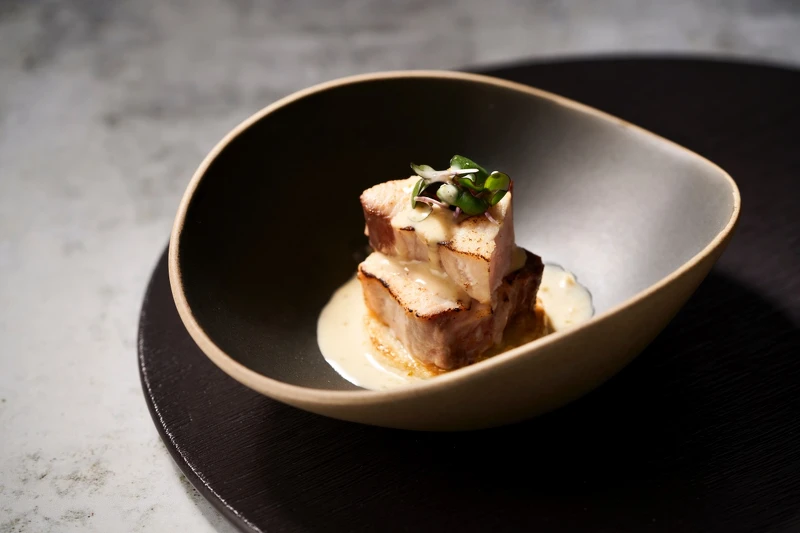 日本青甘魚秋冬季正直最美味的季節,其肉質油脂豐富且滑嫩,以直火炙燒將香氣帶出,搭配脆口山藥及微辣的柚子胡椒醬,食材間互相激盪出多層次口感與甘美滋味。