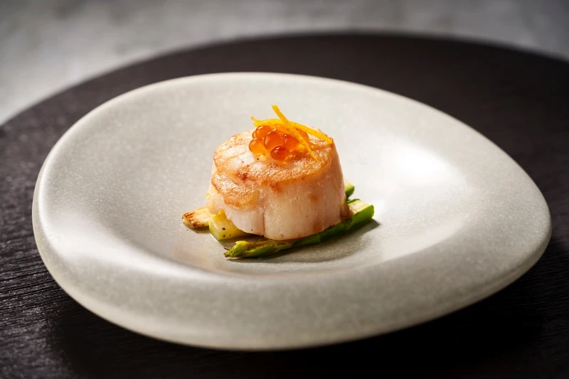 特選北海道M級生食干貝,主廚以大火乾煎至五分熟,再放上鮭魚卵以及柳橙絲點綴,佐玫瑰鹽、胡椒帶出干貝最原始純粹的味道。其中的柳橙絲更是畫龍點睛,更加凸顯出干貝鮮甜滋味,非常好吃!