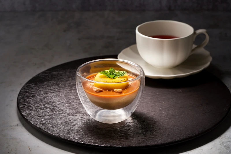 主廚發揮創意將法式火焰薄餅與蘋果卡士達慕斯完美結合。將青蘋果與茂谷柑以茴香、肉桂泡製一晚後在鐵板上加熱,接著撒糖並淋上法國諾曼地蘋果白蘭地,點火揮發,透過酒燒的過程,將白蘭地酒香融入甜點中,最後淋上小火慢熬的手作太妃焦糖醬,清甜不膩口,非常好吃,也替這美味的法式鐵板燒饗宴劃下完美句點。