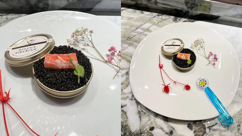 在滿滿的Caviar Giaveri珈費里魚子醬下,隱藏四層美味,包括魚子醬、松葉蟹、白葡萄凍,以及意想不到的酸奶菱角,最下層選用台南官田菱角,綿密口感提升了蟹肉與魚子醬的靈魂。