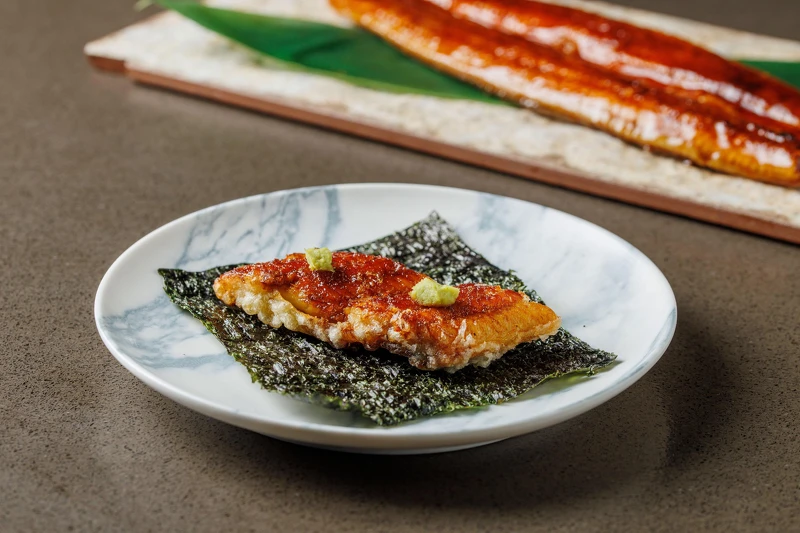 本季菜單亮點還有「蒲燒鰻魚天婦羅」,承襲來自日本天婦羅名店的技術,使用太白胡麻油為炸油,以及低筋薄力麵粉做為麵衣,上桌前將海苔烘烤後,包裹香嫩的鰻魚一起享用,是這次的驚喜之作。