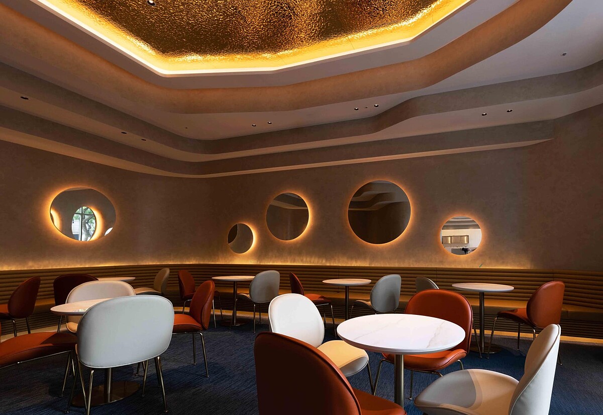法菜餐廳則以「歡聚秋日magic hour的極致美味方丈」為定位,使用色彩鮮明的楓紅、黃杏色轉化作為入口的主視覺,營造秋天的華麗景象。牆面及柱面使用層次豐富的夏沐樹石,打造充滿色彩變化的森林,運用自由軌跡光帶營造秋日慶典感受。
