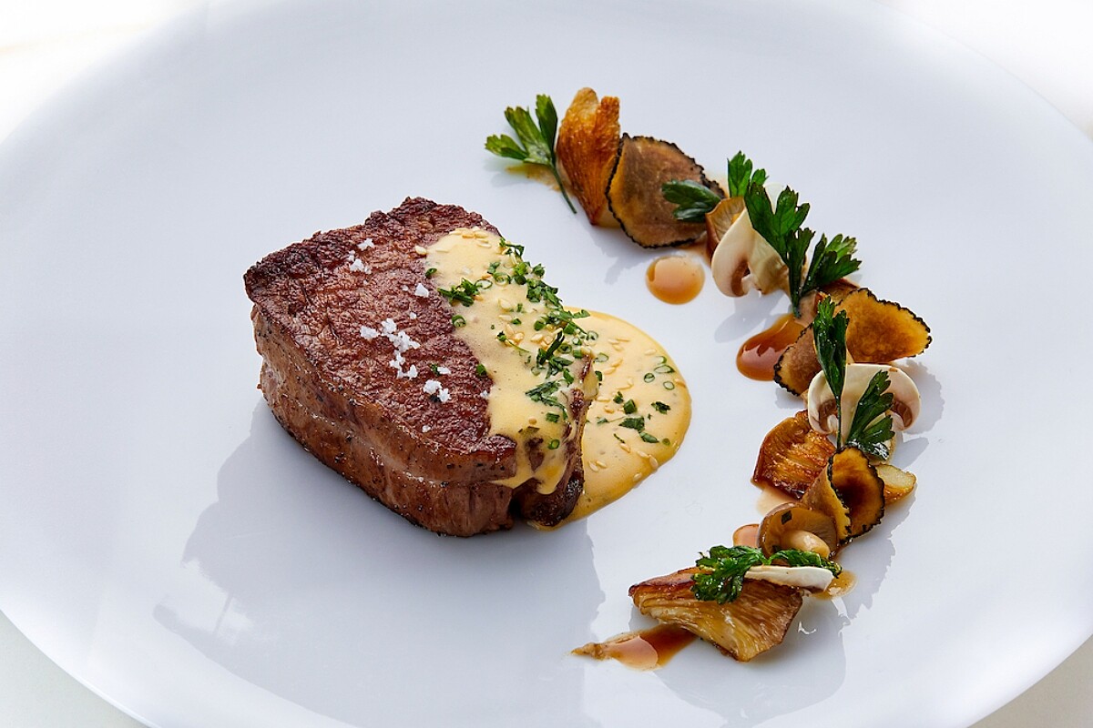 選用日本鹿兒島純種和牛,反覆煎烤靜置、搭配以松露油拌炒香氣十足的秋季蕈菇,蘸取由荷蘭醬為基底變化而成的伯納西醬(Béarnaise),帶些許油脂的軟嫩菲力部位入口滋味迷人,滿足饕客無肉不歡的味蕾。