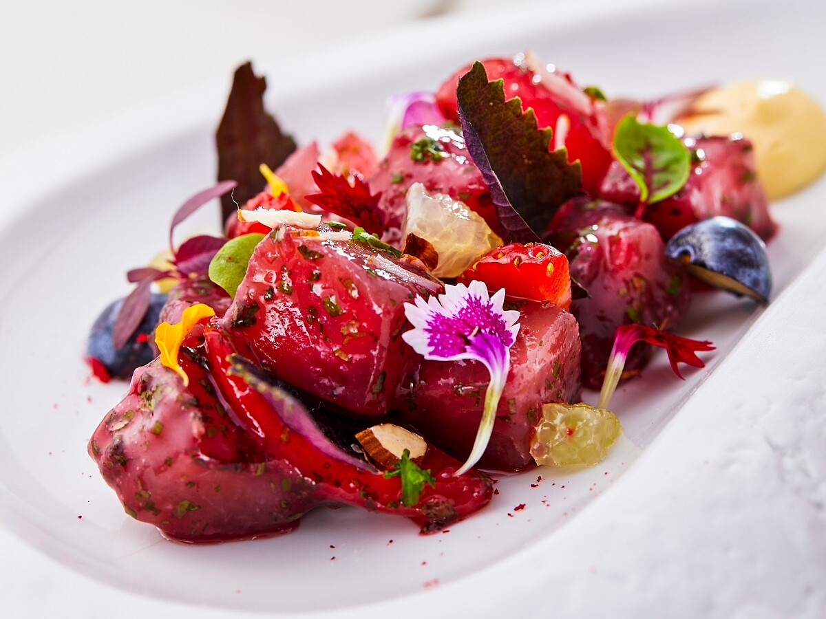選用高雄近海鮪魚,與櫻桃番茄、草莓、西班牙醃漬甜椒、覆盆莓醬等新鮮蔬果食材共拌,並以哈里薩辣醬(Harissa)調味,呈盤色彩繽紛、口感甜鹹酸辣交織,每口都有飽滿層次。