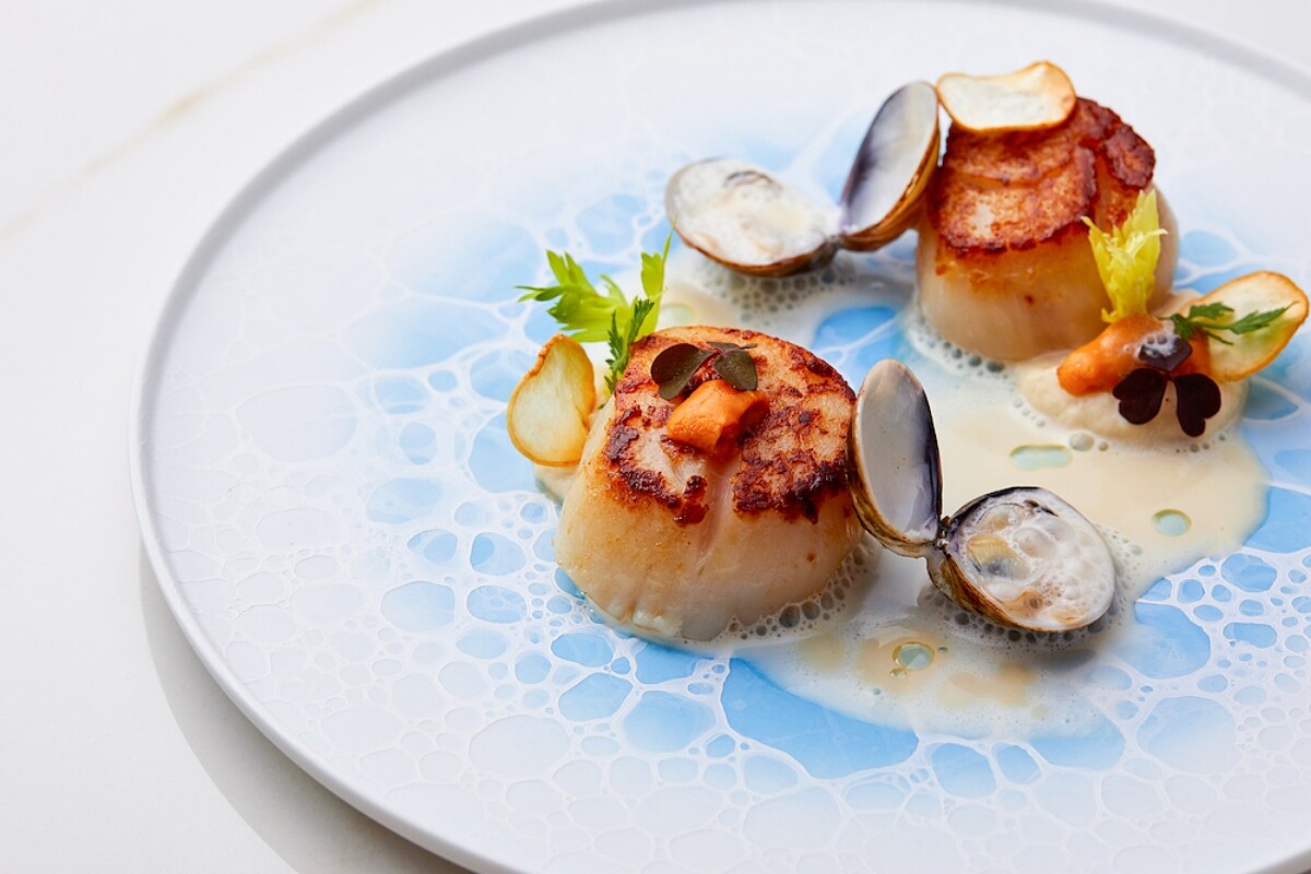 嚴選頂級生食級干貝簡單煎烤,以芹菜根泥調製蛤蠣奶油醬汁,搭配頂級北海道海膽,滿滿的鮮甜海味也呼應港都臨海的城市特質。