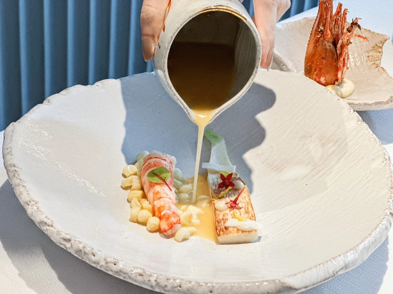 將加拿大牡丹蝦以奶油鐵板乾煎,呈現胭紅色澤且口感Q彈,搭配多汁脆甜台灣水果玉米及嫩煎筊白筍,而玉米梗加入煙燻奶油熬製醬汁至乳白,更替整道料理增添了亮點!另外盛裝的蝦頭酥炸至香脆,可直接品嘗,更顯蝦膏的豐腴鮮香。