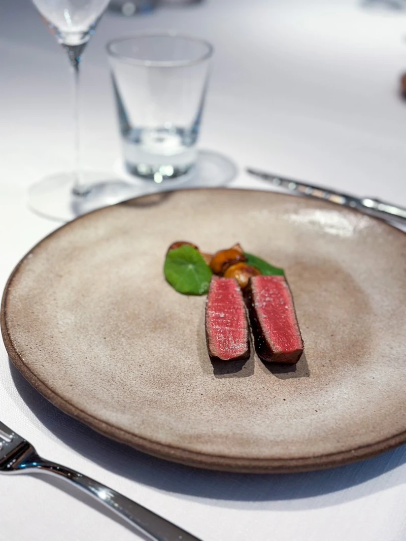 這道菜也是讓小編心心念念的美味!嚴選日本A5熊本牛,其菲力油花分布均勻近乎完美,且肉質軟嫩多汁,以教父牛排招牌的究極料理手法,一氣呵成地將菲力切塊、去邊角筋膜後,經250鐵板煎烤、靜置等步驟,完美鎖住油花精華並呈現粉嫩色澤,入口肉汁。盛脂香濃郁,簡單以鹽之花附味就是極致美味,極致軟嫩,又不膩口的滋味,讓人回味無窮!而一旁肥厚的姬松茸香氣濃郁,而醬汁是以菌菇熬煮成汁拌入奶油熬製的馥郁華美。