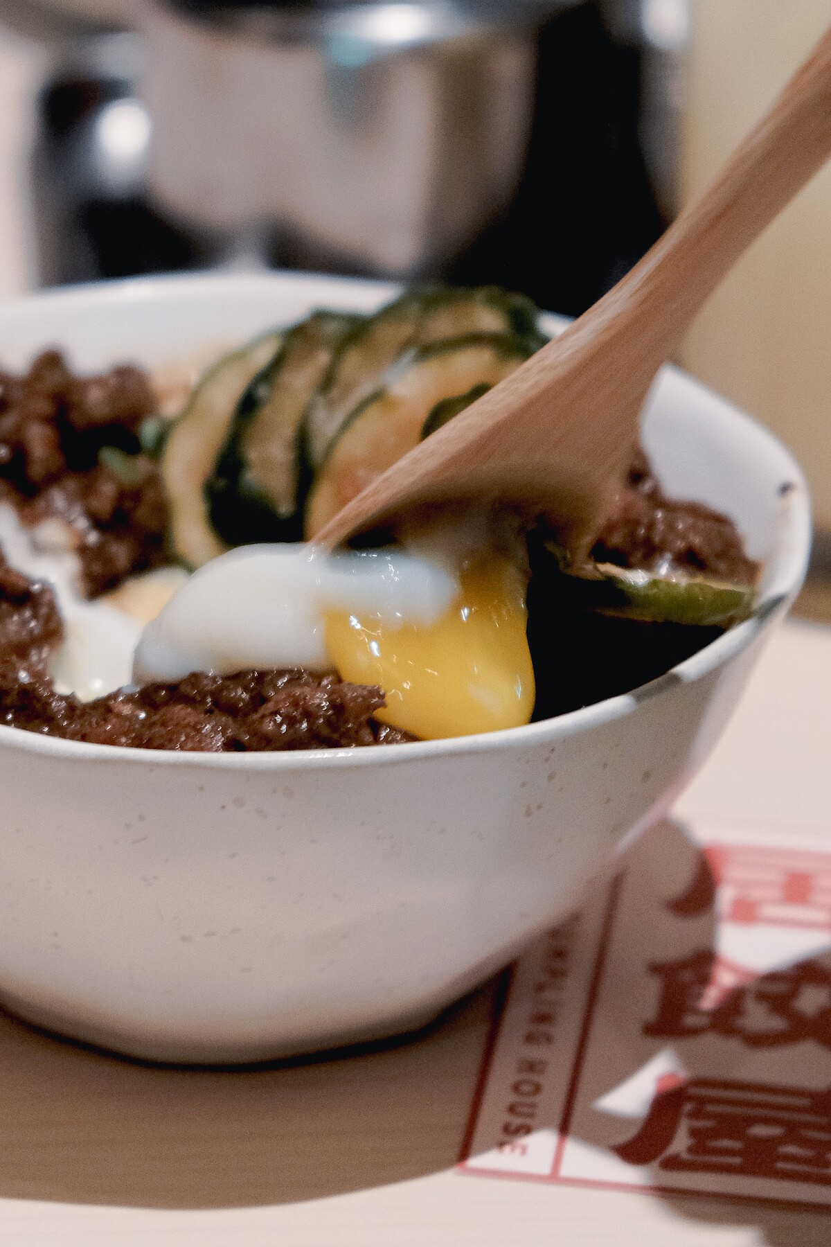 除了煎餃之外,臺虎居餃屋也提供特製日式乾式咖哩飯,著重肉料的調味,在料理本身格外下功夫,沒有過多的醬汁搶戲,而是使用半熟溫泉蛋融合乾咖哩,組成恰到好處的味蕾表現。