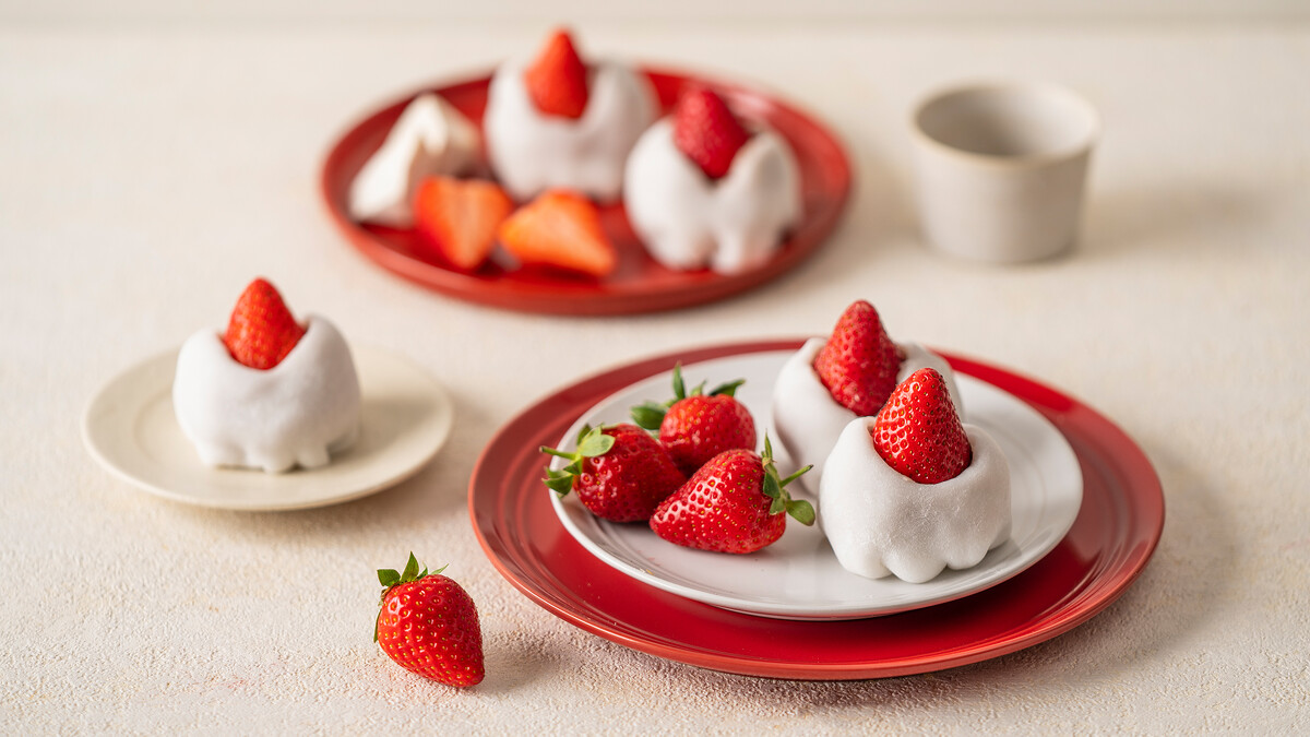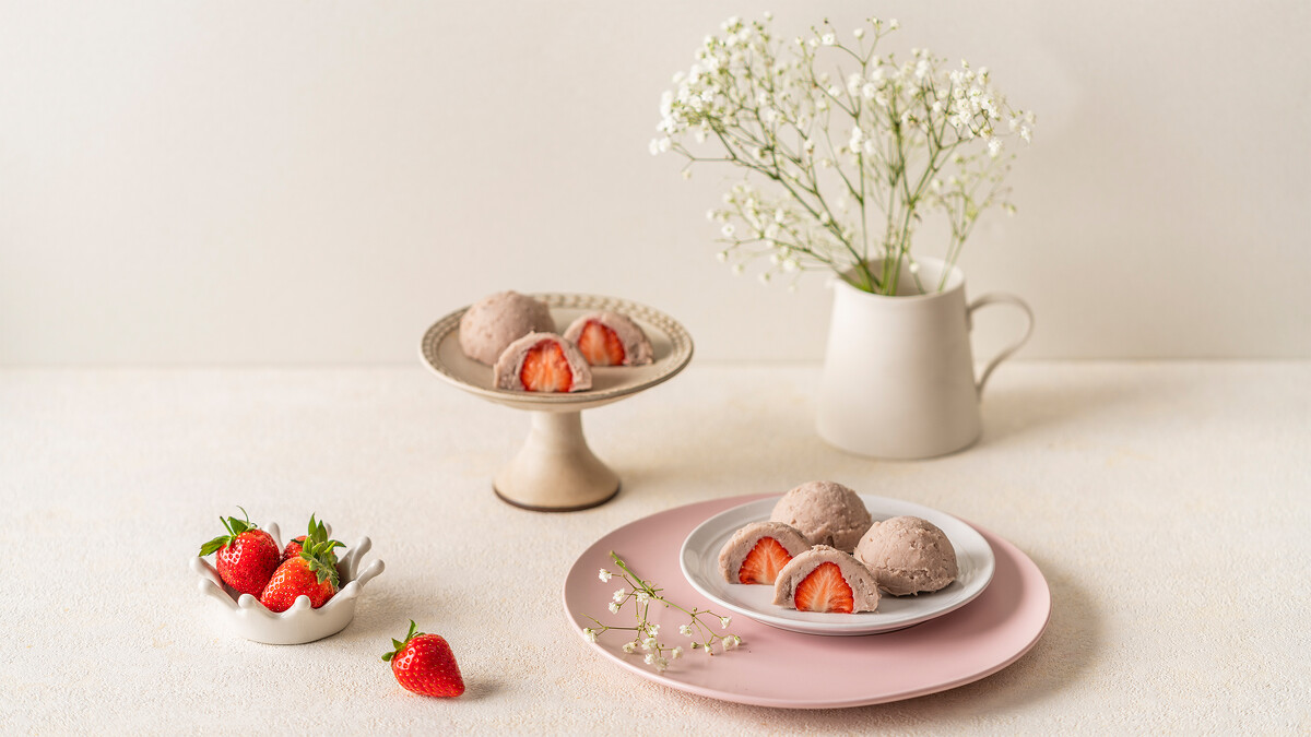 有別於傳統市售的紅豆內餡,而是改以清甜芋頭作為內餡,再加入整顆鮮嫩欲滴的鮮紅草莓,再披上雪白的麻糬衣裳,整體口感Q彈香甜,一次滿足甜點控的視覺與味蕾!