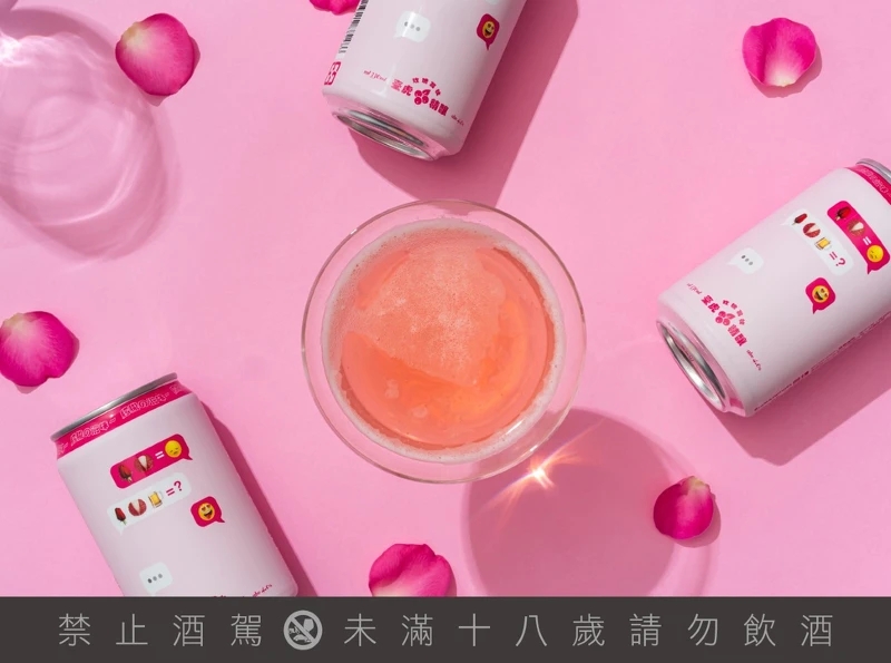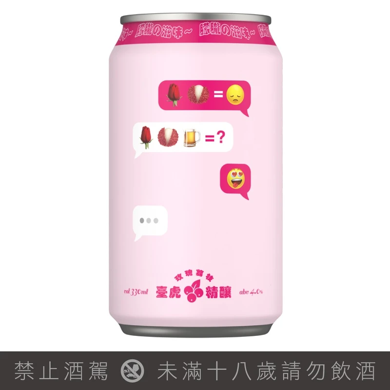 「朦朧玫瑰荔枝啤酒」瓶身以 emoji作為靈感主視覺概念,將玫瑰、荔枝與啤酒的 emoji 呈現出俏皮、逗趣的猜謎對話,同時點出了玫瑰荔枝的風味主軸;整體視覺則以桃紅配色為主,相當活潑可愛。