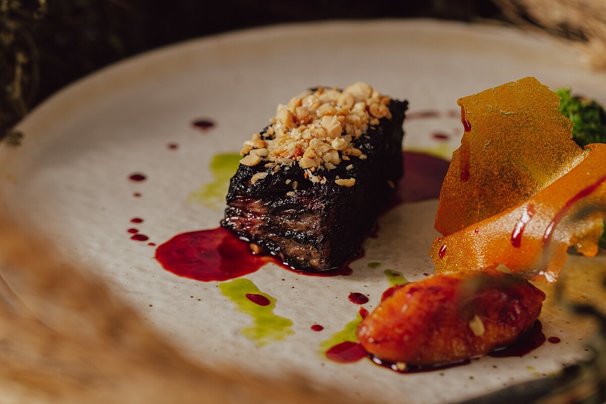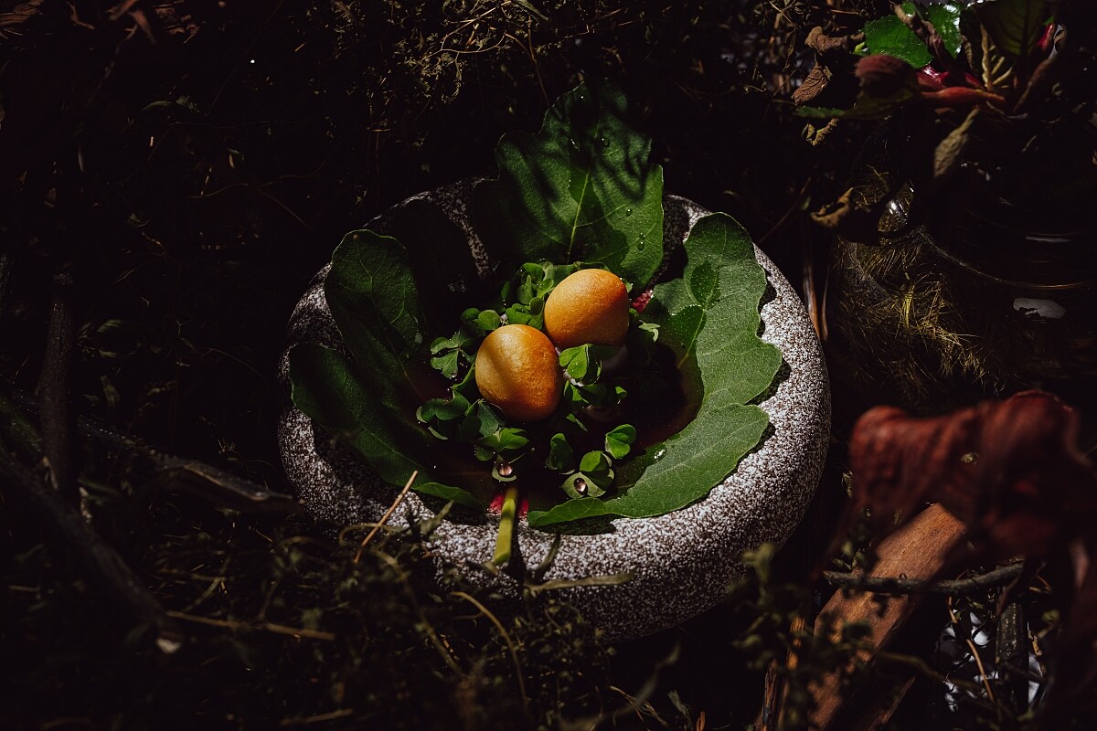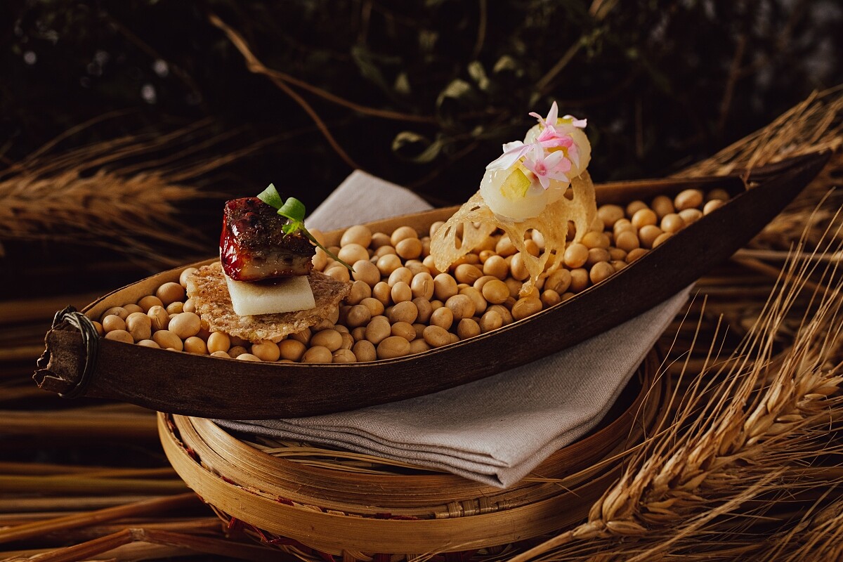 旅程從台灣平原土壤種類出發,有砂質土的鰻魚、黏質土的蓮藕,完整呈現臺灣土壤栽種而出的作物,以細膩的樣貌與風味呈現。 將蕎麥製作成脆餅,乘載著青蘋果與紅肉李的酸楚與燒烤鰻魚的炭香鮮美,是平原海鮮的獨特滋味;蓮藕片則酥炸後點綴新鮮楊桃、西門成都楊桃湯濃漿,與豆薯的爽脆、蓮子泥的濃甜交融,是道兼具口感與芬芳的開胃小點。
