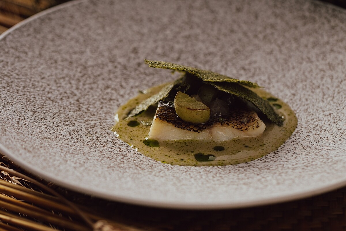 主廚選擇了生長於灌溉平原的的淡水知名魚種—筍殼魚,以簡單的蒸煮搭配濃郁的海鮮奶醬,點綴上叻沙油與羅勒油,再放上炭烤綠葡萄與巨峰葡萄製成的濃漿,最後覆蓋了秋葵脆片。看似簡單卻蘊含豐富的口感,細膩的魚肉與脆口的秋葵脆片、葡萄層層疊疊具有玩心,每一口盡是魚鮮與草本香氣。