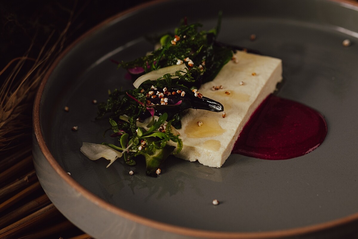 選用高雄選十號黃豆,是好嶼每日現做的新鮮豆腐,搭配上各式各樣風味的東部野菜,以及有超級未來食物之稱的台灣原生種穀物——油芒,並以酸、甜與香料風味的洛神濃漿搭配,最後點上些許初榨花生油,仿若台灣版的花園沙拉,樸素充滿意涵,也完美呈現東部大地秋季豐收的景象。