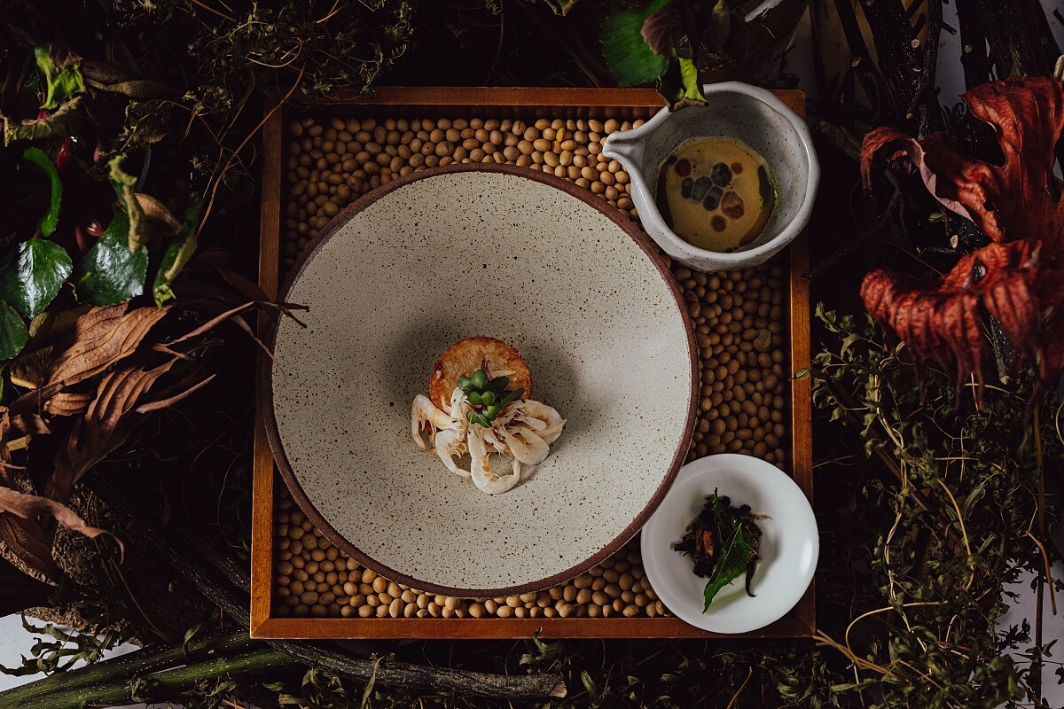 麵包依舊是與Ken Bakery 合作,使用自家發酵酸種製作而成的雜糧麵包,也象徵著秋天豐饒的穀物芬芳。 本季則搭配來自花蓮羅山的泥火山豆腐乳,與發酵奶油結合,並加入辛辣與辛香的巴西利香料油,甘甜鹹香的滋與麵包做了最好的搭配。