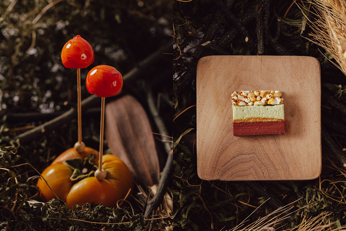 屬於台灣共同兒時記憶的賣米香的叔叔與賣糖葫蘆的伯伯,菜單最終以最具台灣特色的甜點作為收尾。以生巧力、小麥草蛋糕佐上脆口的米香,糖葫蘆則有浸泡過養樂多的柿子,糖衣上最後灑上梅粉,一口咬下是回甘甜蜜的滋味。