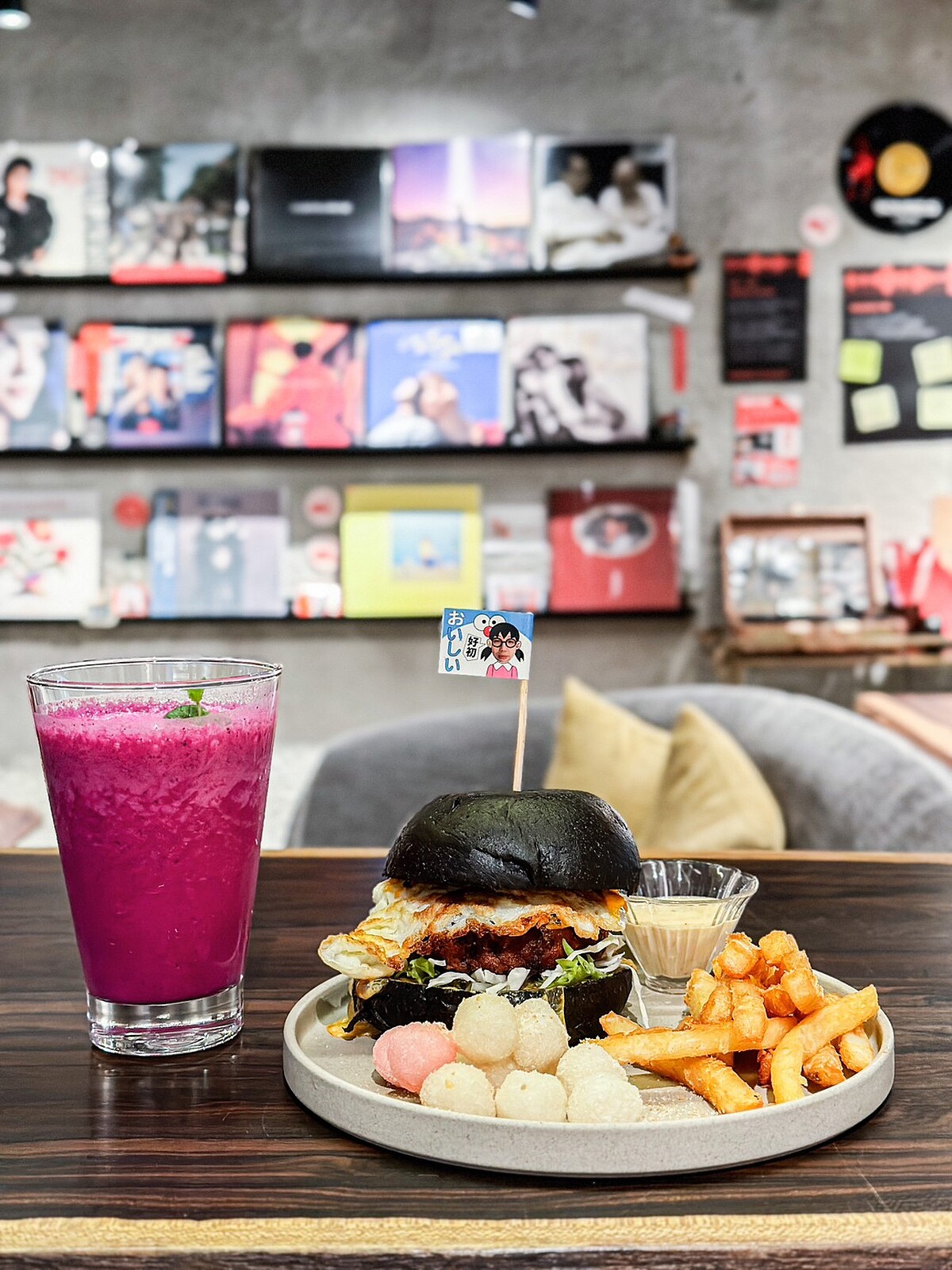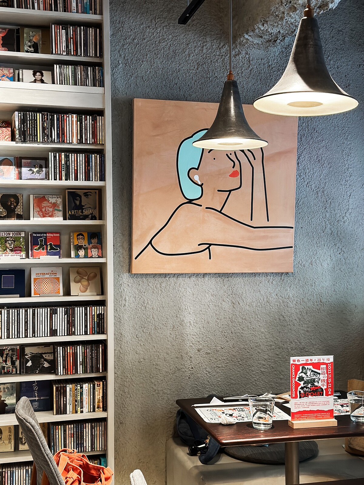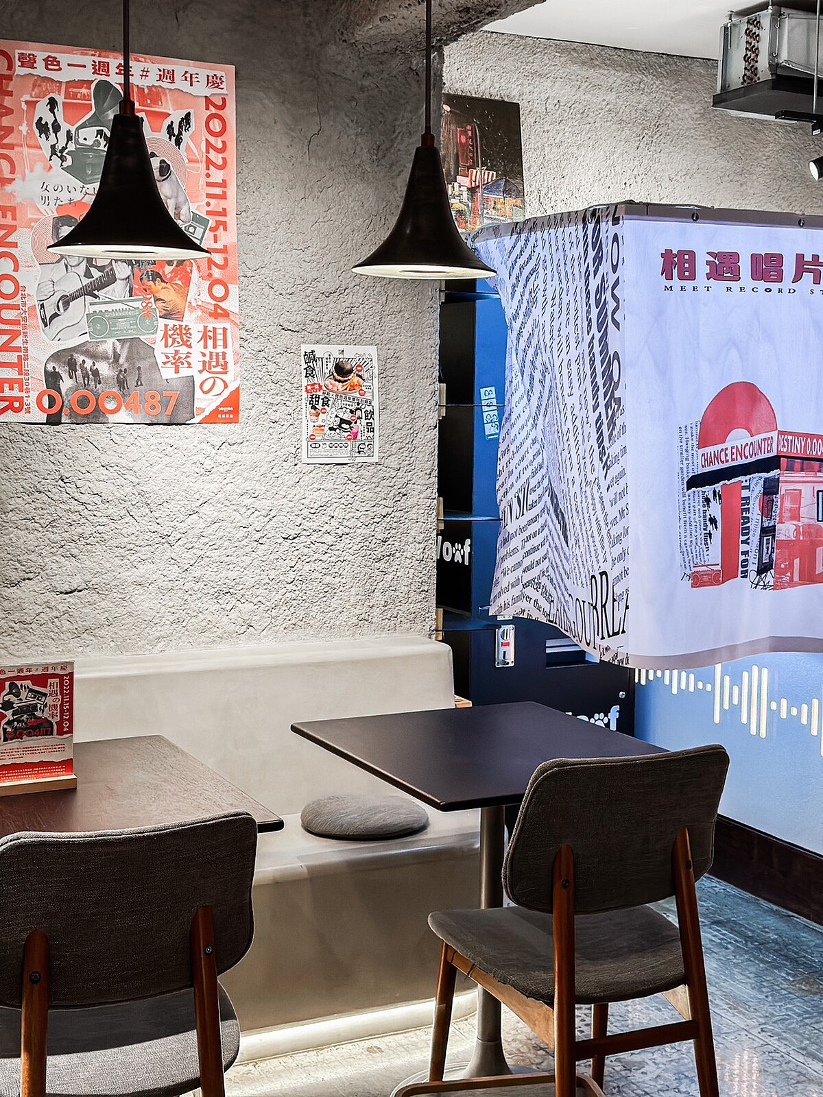 室內用餐空間走空業風格,連燈飾都是以喇叭為發想訂製而成。店內更擺滿了上萬張的音樂載體展示,以及各式各樣的手提收音機、黑膠唱片機、留聲機…等。