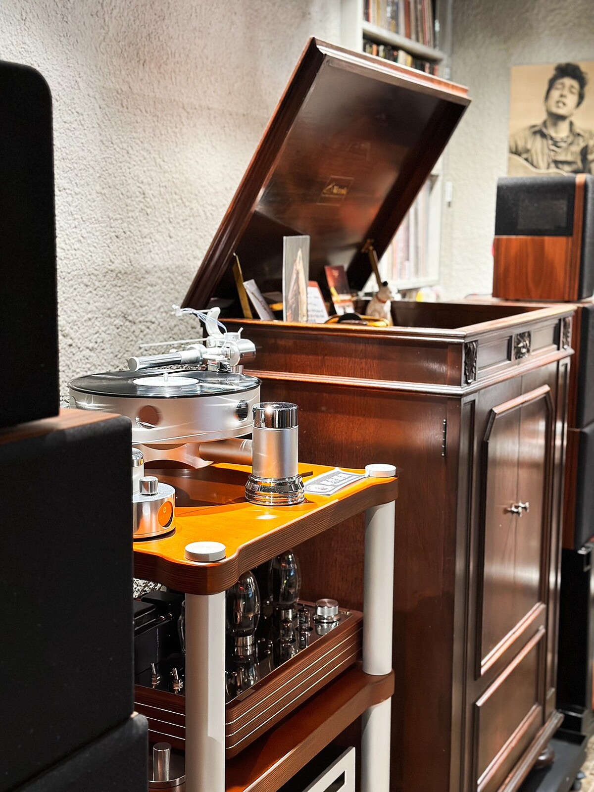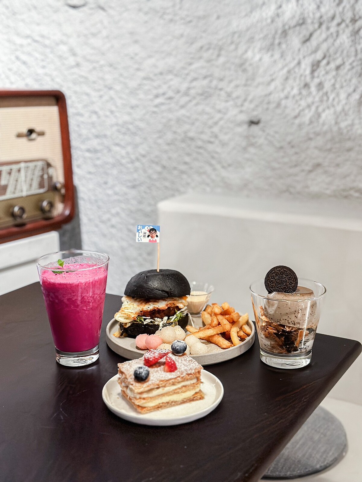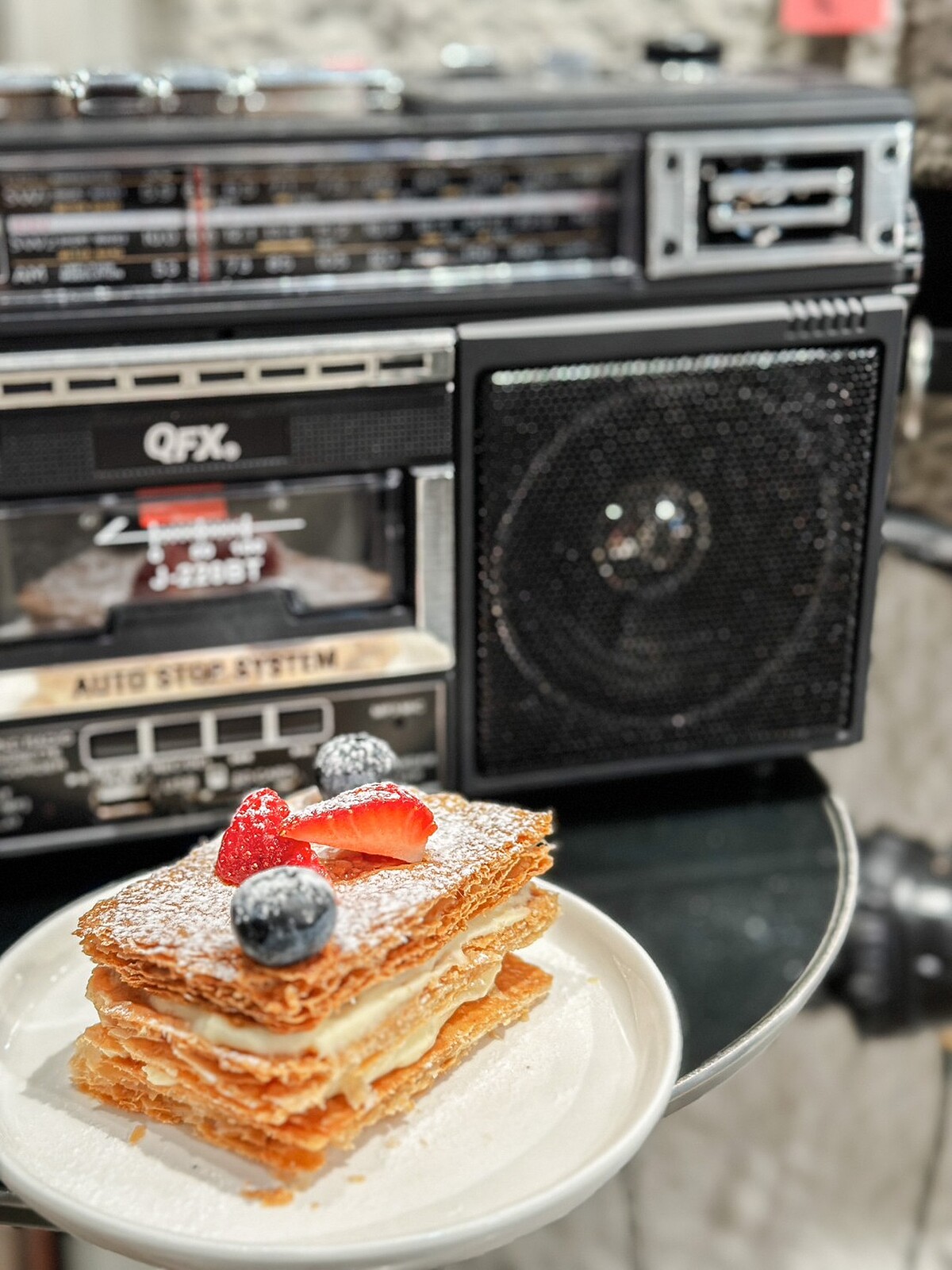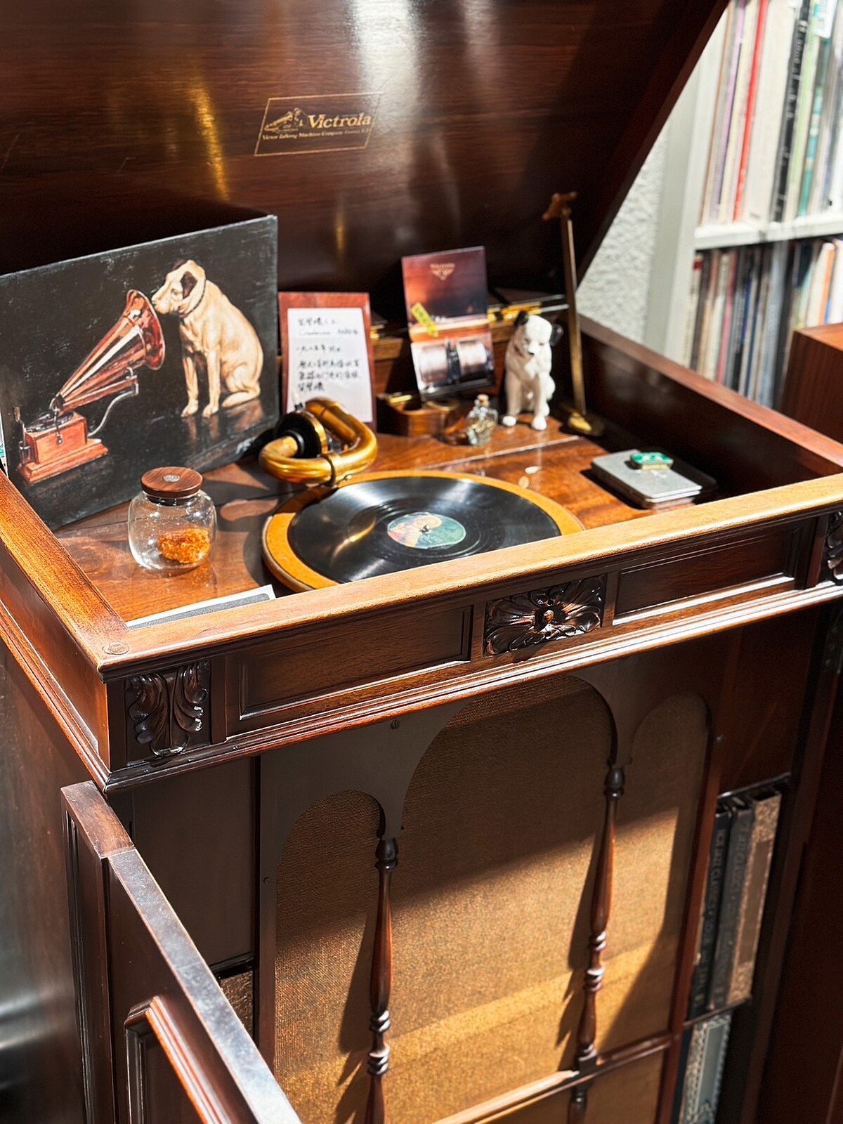 室內用餐空間走空業風格,連燈飾都是以喇叭為發想訂製而成。店內更擺滿了上萬張的音樂載體展示,以及各式各樣的手提收音機、黑膠唱片機、留聲機…等。