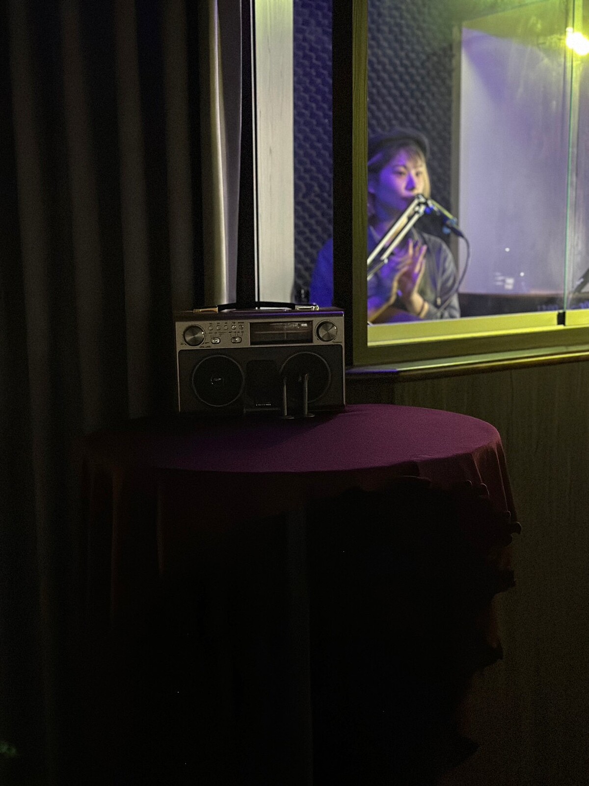 而2022無光晚餐又帶給了我截然不同的新體驗,在入場前會引領大家來到彷彿電台的空間中等待,這裡也是無光餐廳中唯一可以拍照的空間,氣氛營造得很好,但小編一直有種準備玩密室逃脫,要留心找出線索的感覺!最後電台DJ也會逐步用聲音帶領大家逐漸進入屬於自己的故事當中!