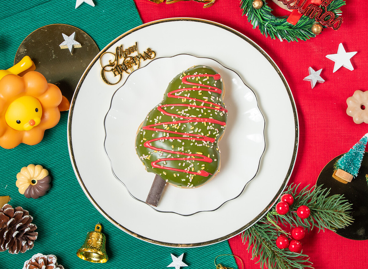 這款絕對是必買首選之一!以鬆軟巧貝麵團為基底,製作成聖誕樹的形狀,麵團外表沾滿抹茶巧克力沾醬,再擠上擠滿酸甜草莓鮮奶油內餡,並以蘋果可可沾醬與水果風味可可米做裝飾,吸睛又可愛!